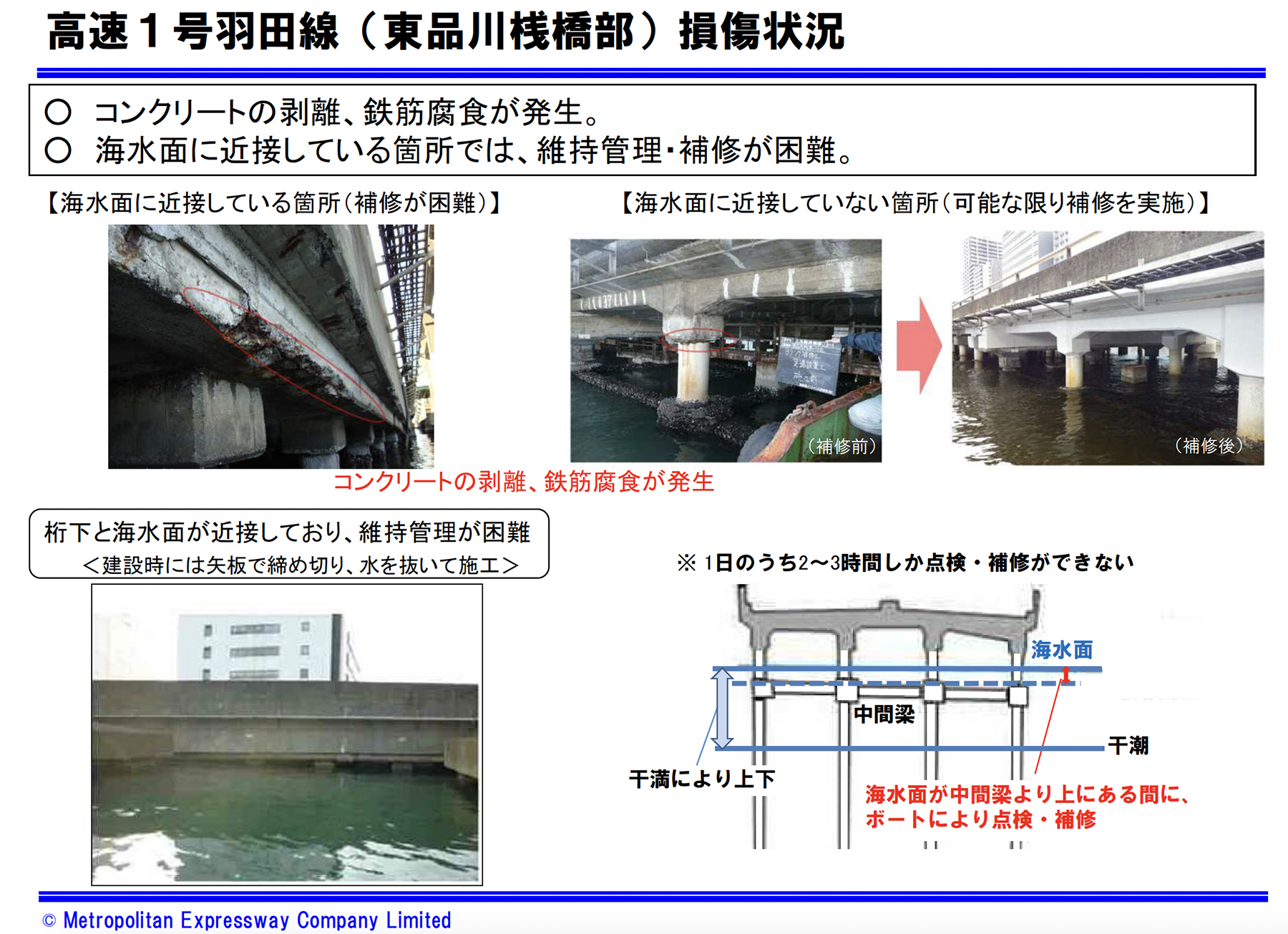 冒頭、事業を所管する更新・建設局が更新事業の背景とこれまでの経緯を説明した。首都高速道路全体では大規模更新8.8km、大規模修繕76.5km(https://www.shutoko.co.jp/company/enterprise/road/plan/)が計画・実行されている。東品川桟橋~鮫洲埋立部区間はその一部で、延長約1.9kmを占める。この区間は、都心側約1.3kmが海上桟橋構造、南側が埋立構造で構成されている。供用開始は1963年からで、東京オリンピックを控えた短期間で整備された経緯を持つ。海面に近い位置にRC構造が配置された桟橋部では、飛来塩分や潮位変動の影響を受けやすく、コンクリートの劣化や鉄筋腐食が進行していた。潮位の影響を受けるため、点検や補修に充てられる時間が限られるなど、維持管理上の制約が顕在化してきたことが、更新に至る大きな要因として挙げられた。