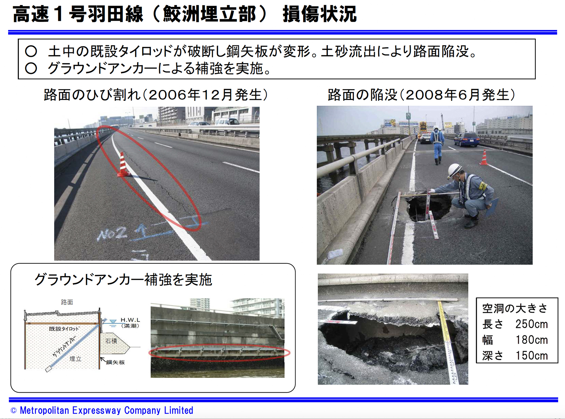 一方、鮫洲埋立部では、過去に路面のひび割れや陥没が発生している。これは、埋立構造内部に設置されていた既設タイロッドの破断により鋼矢板が変形し、土砂流出が生じたことが原因とされている。これに対しては、グラウンドアンカーによる補強が実施され、一定の安全性は確保されてきたものの、構造形式そのものが抱える不安定要因を根本的に解消するには至らなかった。