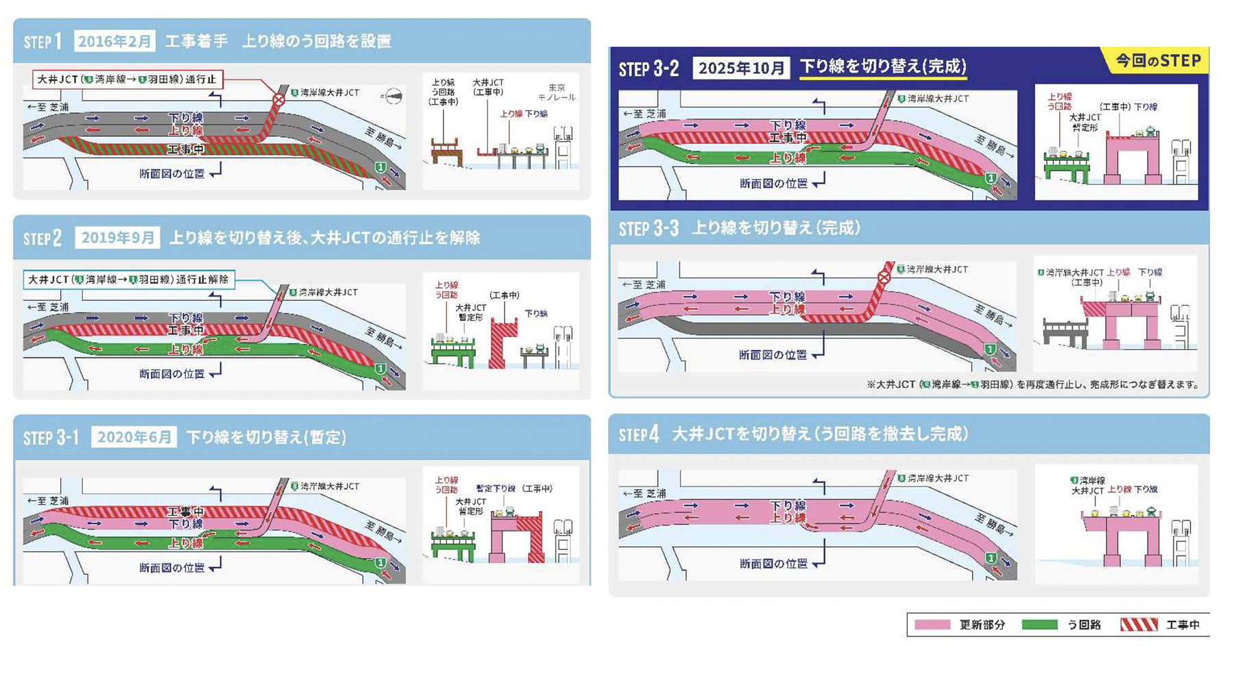 その後の予定としては、上り線の走行ルートをう回路から新しい道路(更新線)へ切り替え、その後、大井JCT接続部をう回路から新しい道路(更新上り線)へ切り替える。大井JCT接続部の切り替えにあたっては、大井JCT連結路を通行止する予定だ。