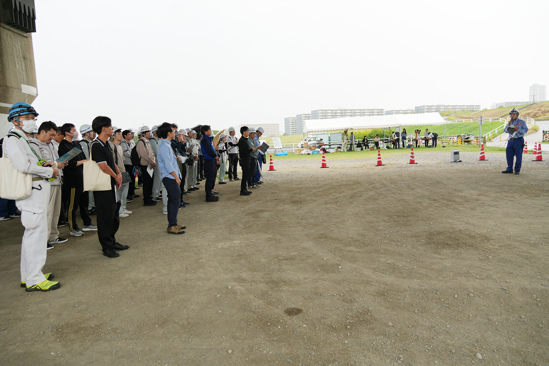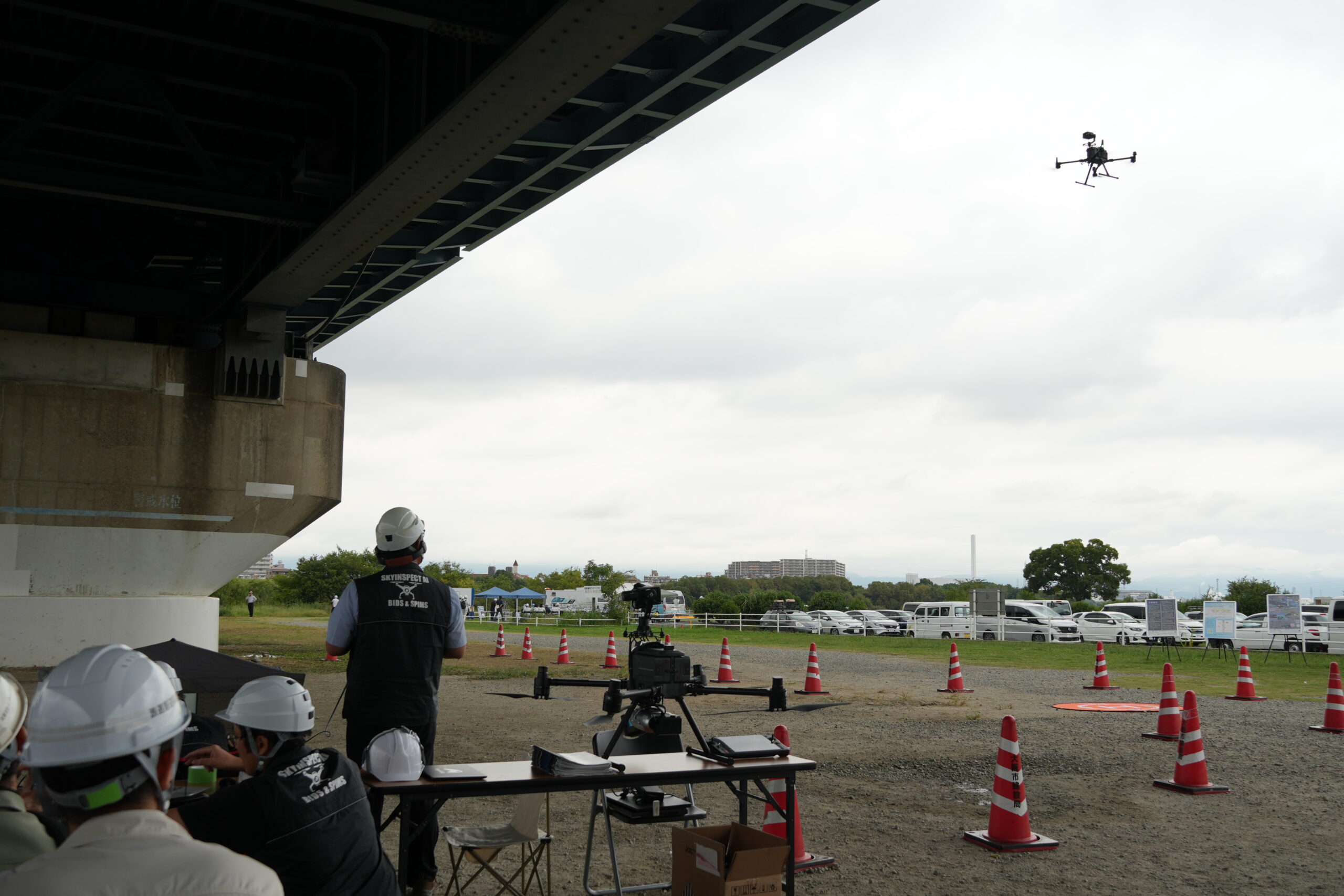 出展企業は26社。事前登録者は228名にのぼり、ドローン、水中ロボット、非破壊検査、AI解析、帳票のデジタル化など、点検業務の現場に直結する技術が一堂に会した。室内展示ではなく、あえて実橋梁・実河川を会場とした点に、本体験会の思想が端的に表れている。