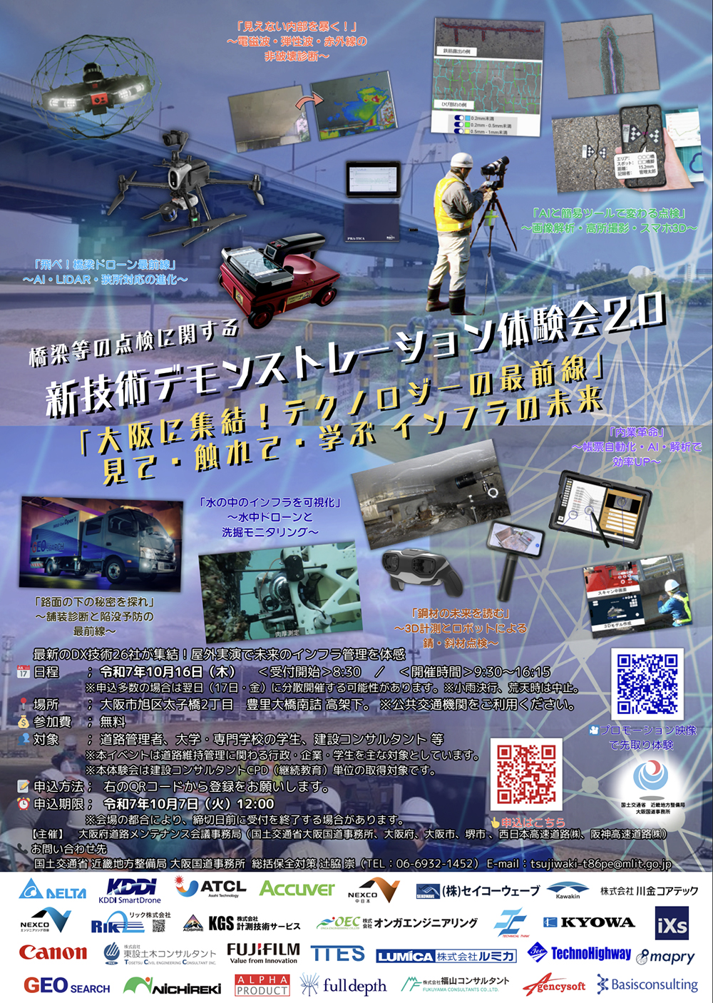 大阪府道路メンテナンス会議は2025年10月16日、大阪市の豊里大橋高架橋下において、橋梁等の点検に関する「新技術デモンストレーション体験会2.0」を開催。府内すべての道路管理者をはじめ、大学生・専門学校生・高校生など土木工学を学ぶ学生、建設コンサルタントを対象に、新技術を活用した橋梁・舗装・路面下空洞などの点検手法を実演形式で紹介した。会場には、点検支援技術性能カタログ等に掲載されている企業26社が出展し、最新のドローン点検や水中ドローン、舗装・空洞調査、コンクリート診断、鋼材点検、デジタル支援技術など、多彩な点検技術が披露された。