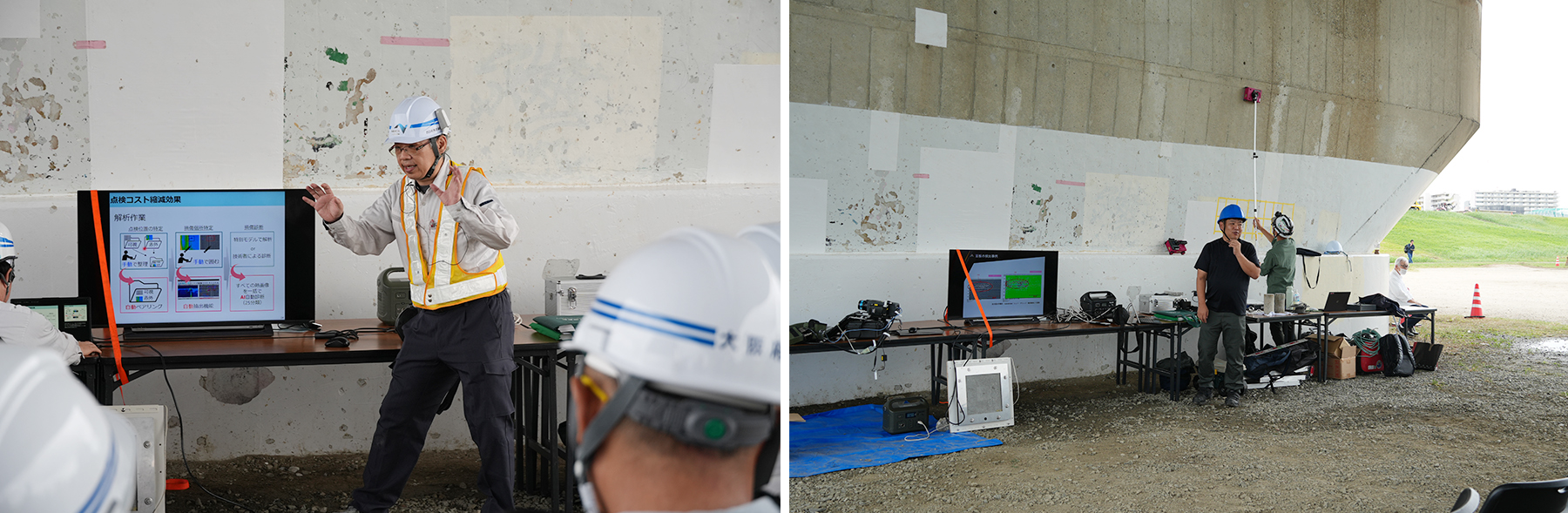 本体験会は昨年度に続き、今年で2回目の開催となる。大阪府道路メンテナンス会議では、これまでも会議体の中で点検や維持管理の課題について議論を重ねてきたが、「議論するだけでは現場は変わらない」という問題意識があったという。そのため、あえて屋内展示ではなく、橋梁高架下や河川といった実際のフィールドを会場に選んだ。点検技術は、実際に構造物に当ててみて初めて分かることが多い。室内で説明を聞くだけでは、その技術が現場で使えるかどうかまでは見えてこない。本体験会は、そうした現場感覚を共有することを目的に、あえて屋外・実構造物を会場としている。辻脇氏は、「使えるかどうかを、その場で確かめてもらいたかった」と語る。また、本体験会では、競合する技術や異なるアプローチを同一テーマの中で並べる構成が採られている。「技術の優劣を決める場ではなく、組み合わせや使いどころを考える場にしたい」という考えからで、出展者同士のマッチングや、新たな連携が生まれることも意図している。