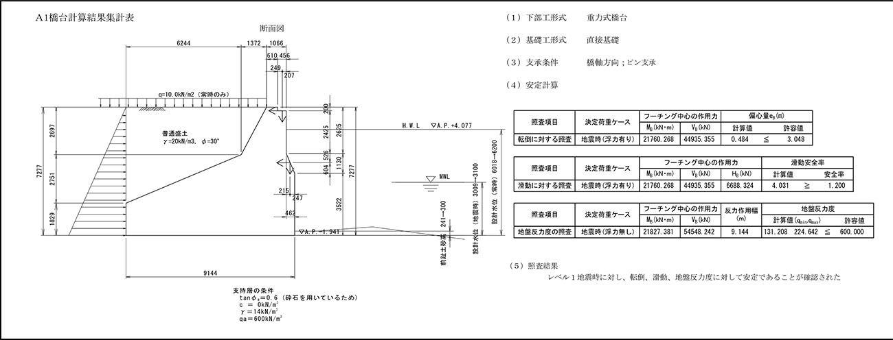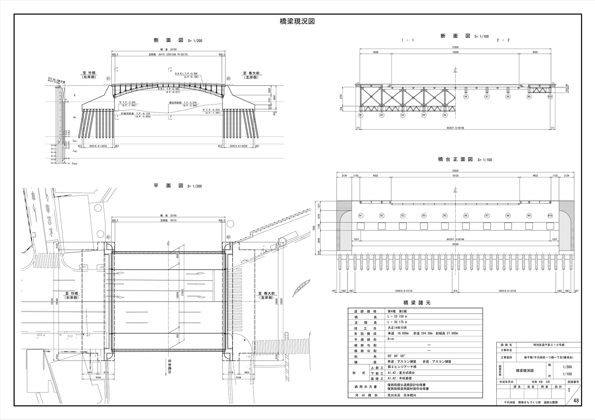 同橋は1925年に供用された(製作は東京石川島造船所(現在のIHIインフラシステム))、 橋長32.156m、幅員27m(歩道4.5m×2、車道18m)の鋼2ヒンジアーチ橋である。斜角、曲線はなく直橋である。下部工は重力式橋台。基礎工は木杭基礎であるが、杭径、杭長が不明なため解析時には直接基礎として考慮した。建設時の示方書は復興局道路設計仕様書と復興局橋梁用鋼材製作仕様書を適用して建設された。幸いなことに図面は存在していた。