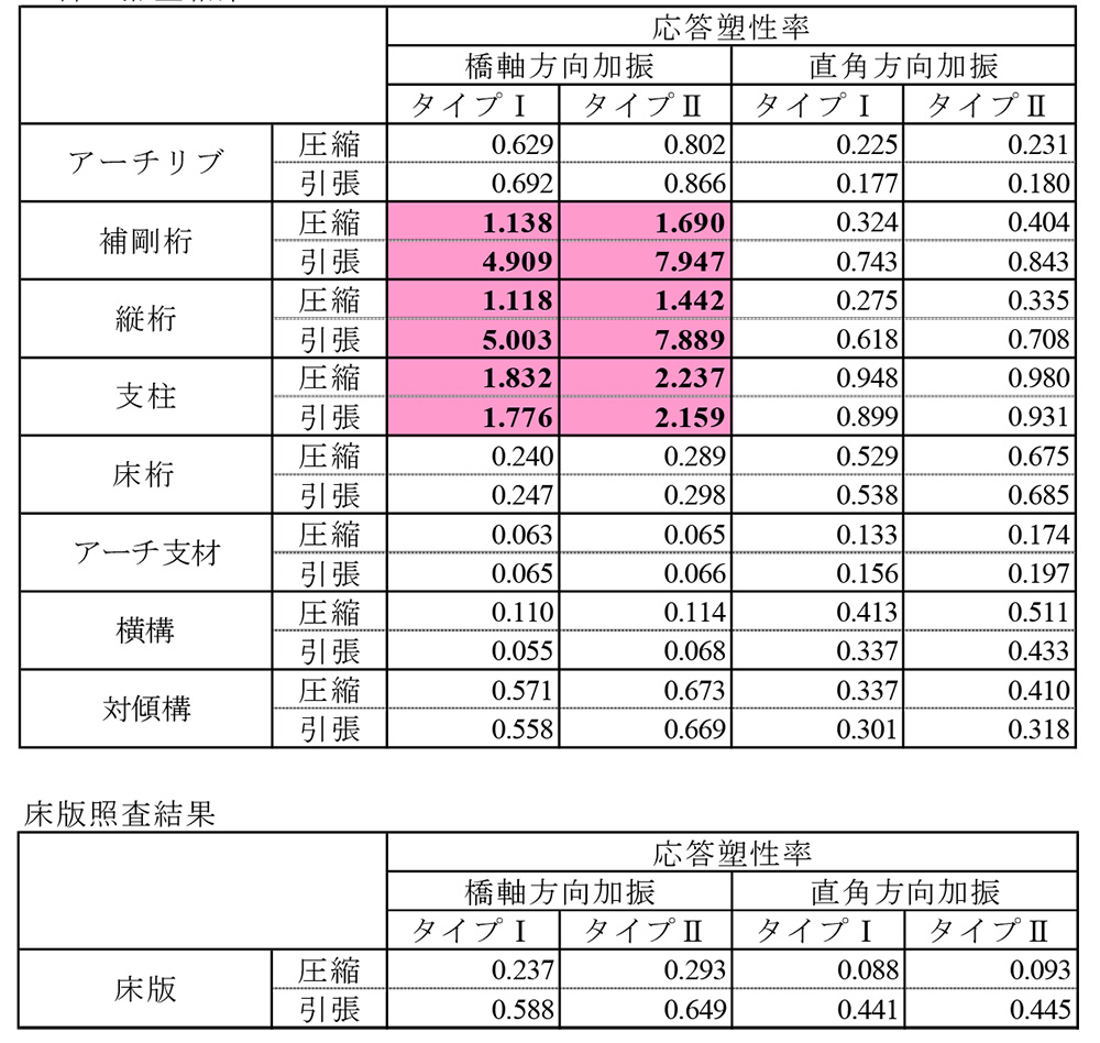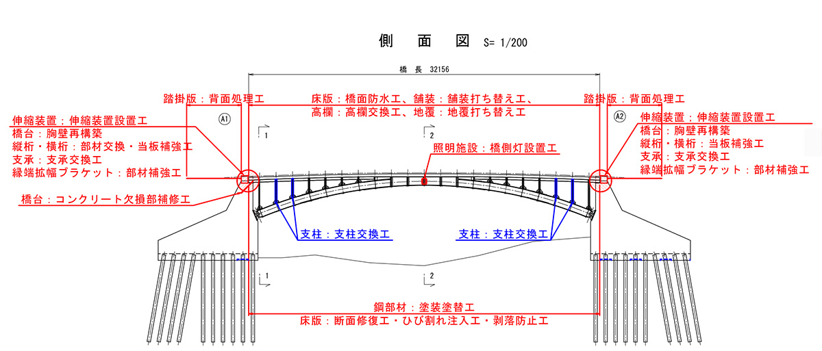 同橋について、照査を施した結果、橋軸方向加振時の応答塑性率において補剛桁、縦桁、支柱で引張、圧縮ともにNGが出た。とりわけ補剛桁、縦桁においては引張でNGが大きく、タイプⅠでも補剛桁で4.909倍、縦桁で5.003倍、さらにタイプⅡでは同7.947倍、同7.889倍に達した。また、鋼材、支承部で欠損が生じており、歩道部のRC床版でもそれほどひどくはないがエフロレッセンスやひび割れ、剥離、鉄筋露出などが生じている。高欄や親柱についても、親柱の格子窓が完全に取れている状況にあるため、その復旧と、照明機能が損傷し配線も破断しているためその補修も行う必要がある。また欄干は桟の折損などが生じていた。そのため補強が必要となるが、一方で他2橋と同様、景観を重視せねばならず、見た目はできるだけ変えずに補強することが求められる。