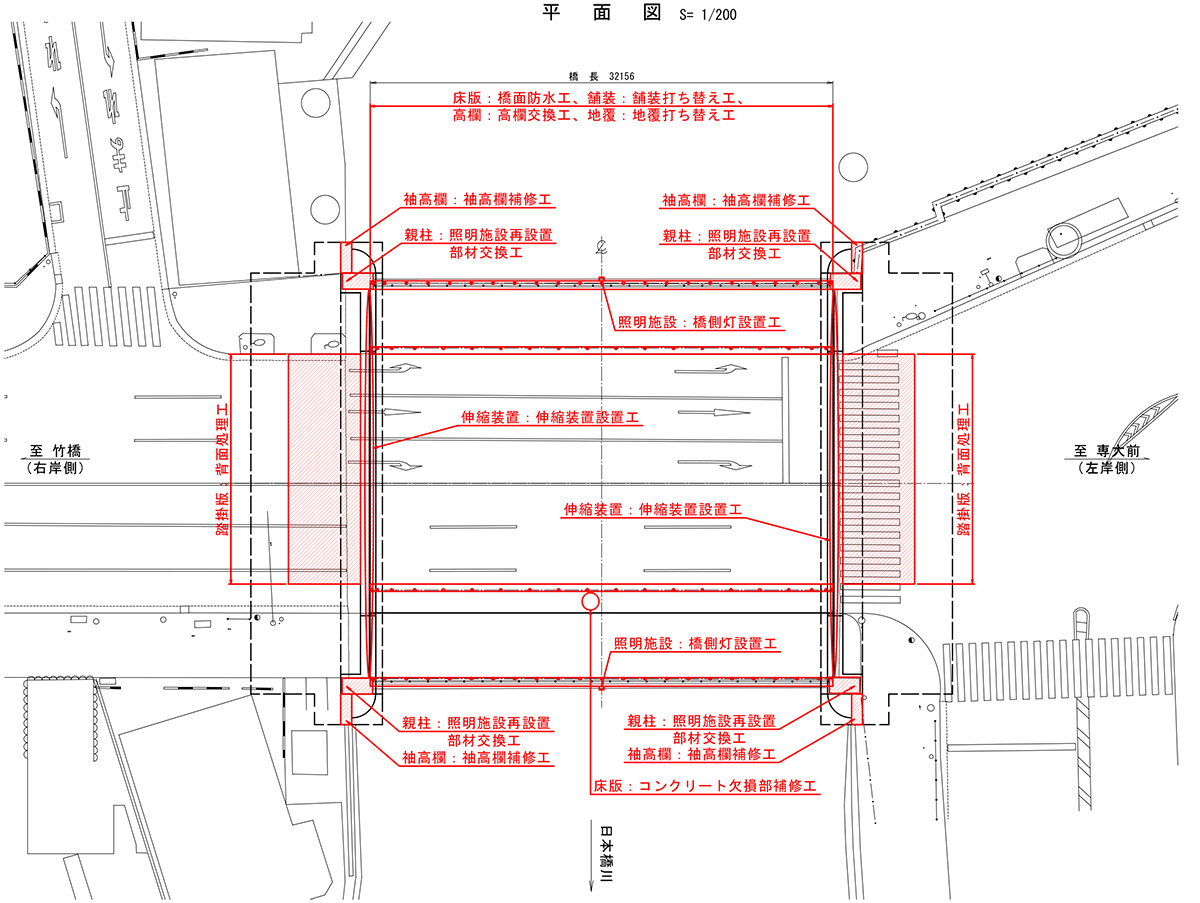 新たな支承の種類は「現在検討している最中で、免震ゴム支承にするかどうかも含めて、年内に方向性を出す方針」(千代田区)としている。足場設置後に実際の構造物を照査した結果、図面と現場が異なっている個所が少なからずあるため、再度計算し直し、支承の種類を検討し直す必要が生じたためである。