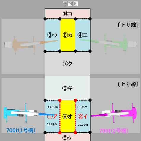 22時から事前に設置されていた上り線の2台の700tクレーンの向かいの下り線に2台700tクレーンを設置。23時から本格的な撤去作業が始まった。側径間張出①ア②イ③ウ④エの1断面をワイヤーソー、コンクリートカッターで切断し、撤去した(下図参照)。クレーンの安全対策として撤去部材重量に対して定格総重量の安全率85%で計画している。