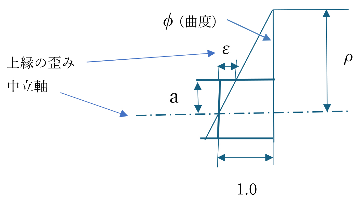 図に示すように断面の上縁の歪みεを上縁から中立軸までの距離a で割ったε/a が歪み勾配でこれが本来の曲度Φです。図から明らかなように歪み勾配を構成する3角形は、曲線半径ρと中立軸での無次元の長さ1.0とで構成される三角形と相似ですので、歪み勾配はε/a = 1/ρであり、1/ρと一致するのです。したがって、梁のように太さを持つ線状の物体の曲げ形状は曲度によって表現するのが妥当なのです。