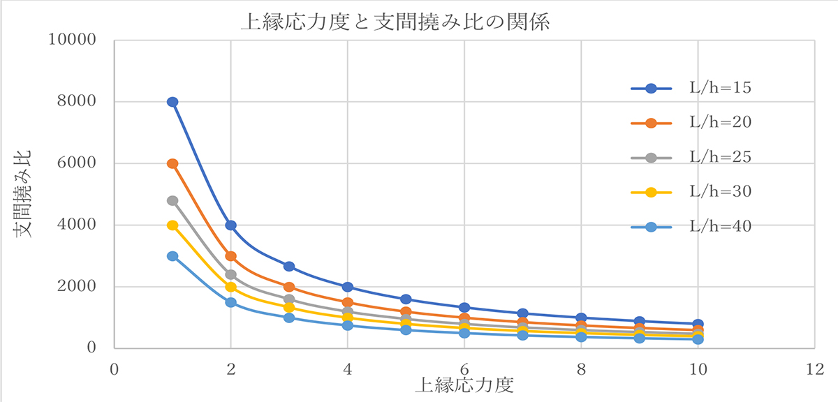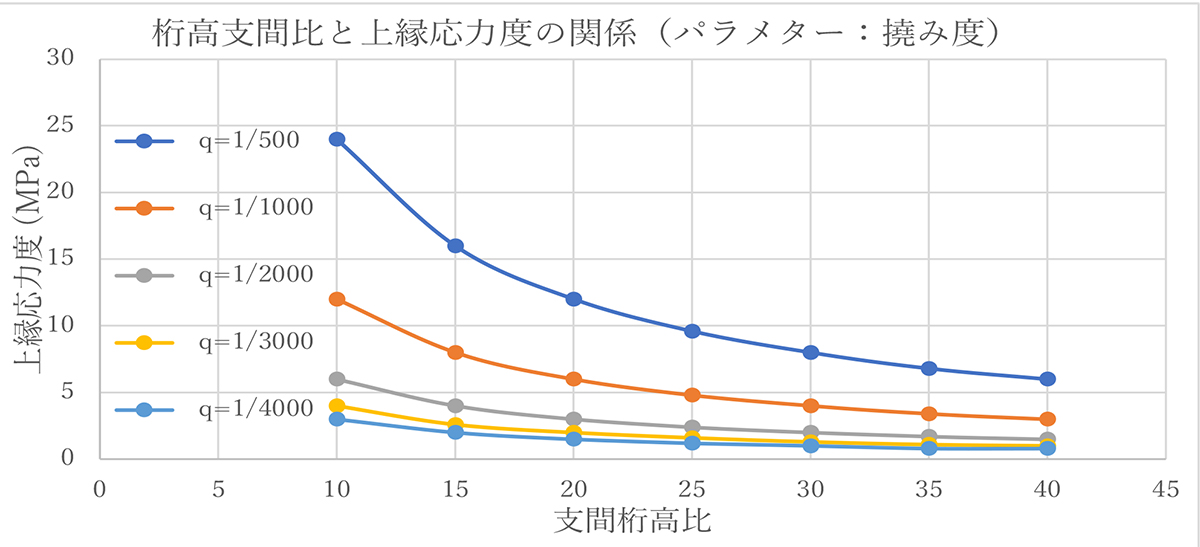 図-2 撓み度をパラメターとした支間桁高比と上縁応力度の関係