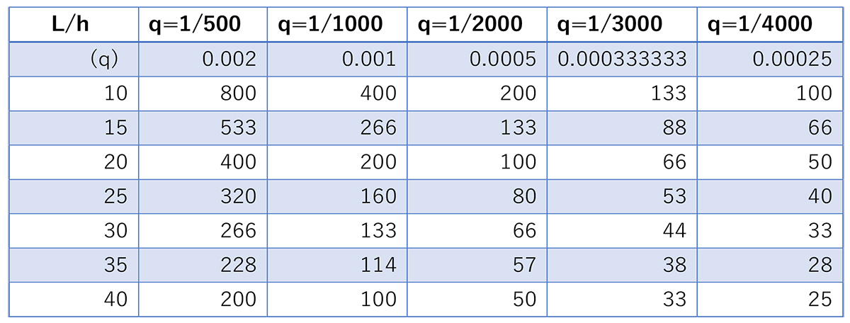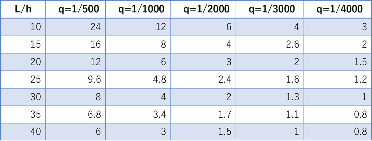 表-1 支間桁高比(L/h)と撓み度(q)に対応する湾曲率(w)の値 (x10-6)