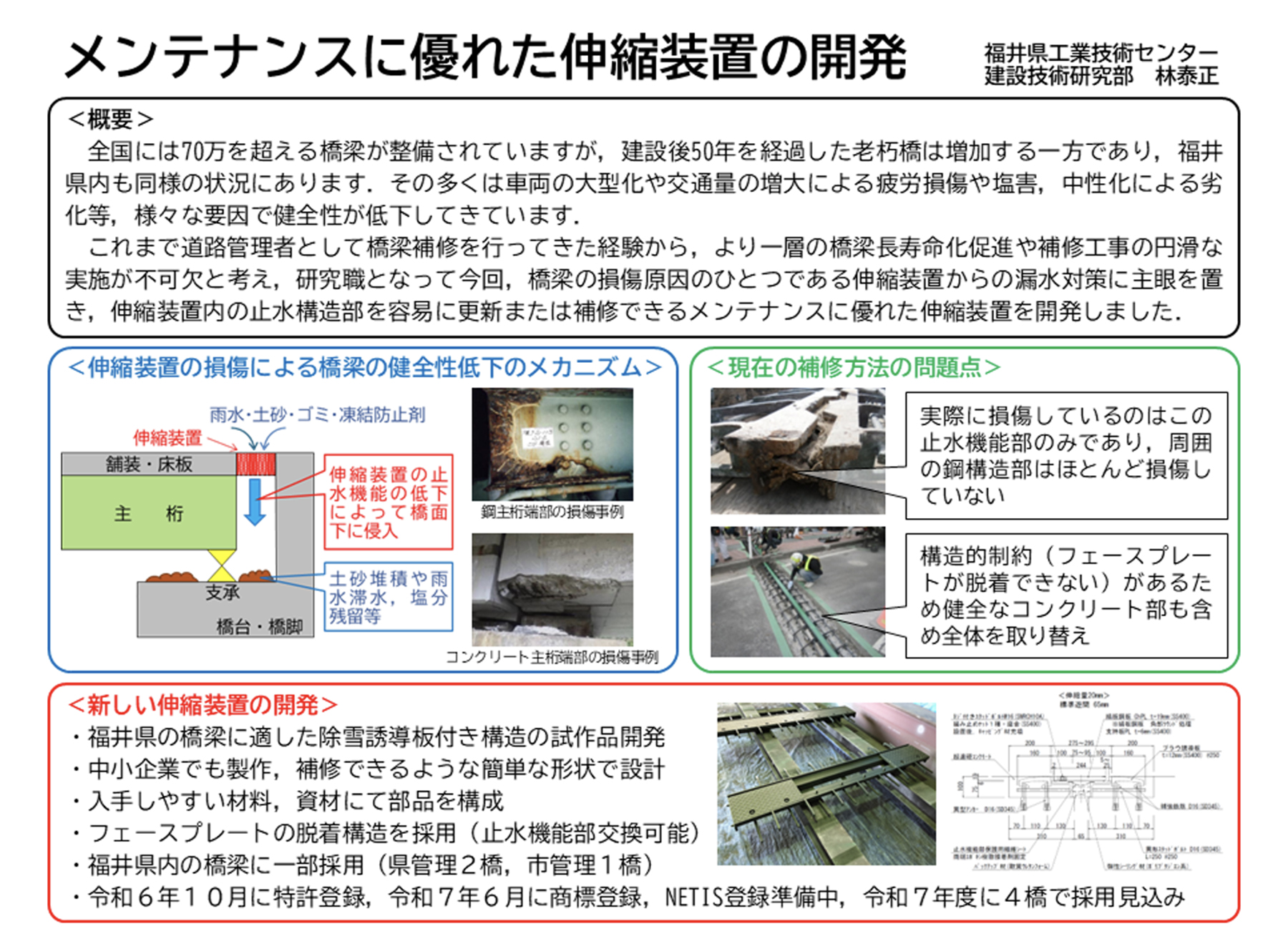 概要:橋梁の桁端部は、止水機能の低下に伴って漏水し、橋台に土砂堆積や雨水の滞水等が発生する。これが、桁端部の損傷や支承の機能低下を招いている。伸縮装置は、一般的には専門業者によって開発されるが、福井県⼯業技術センターの林 泰正氏は、道路管理者の立場で自らの業務上の経験に基づいてメンテナンスに優れた伸縮装置の開発を行い、特許を取得した。また、実際に供用されている地元の橋梁にも開発した伸縮装置が採用された。