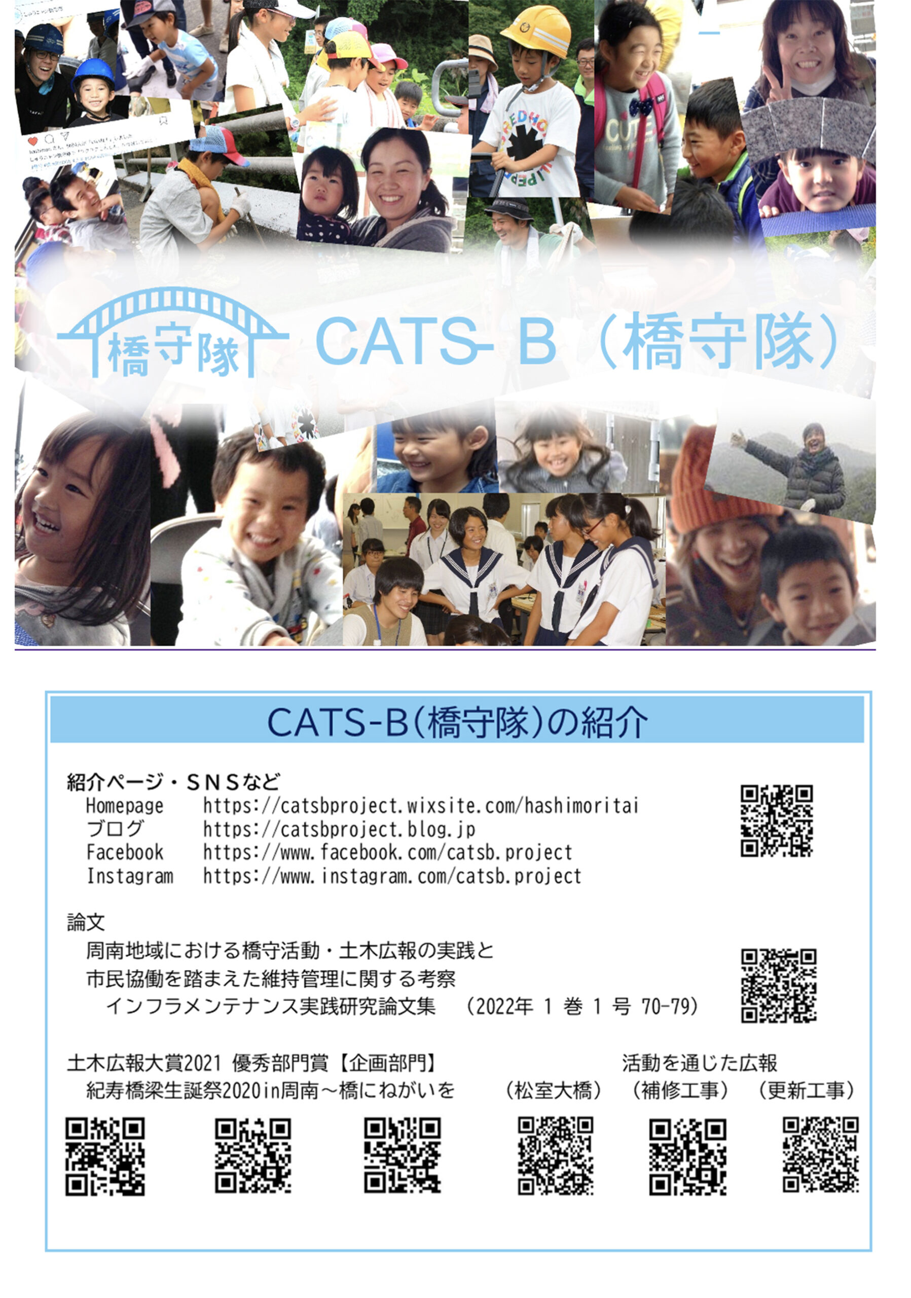 概要:橋を主なフィールドとして、「楽しみながら」市⺠レベルのインフラメンテナンスを実践することで、土木インフラの大切さを共有するための活動を 10 年間行っている。⼭⼝県周南市を拠点に、産官学⺠が協働して、橋の清掃、橋やインフラに親しむイベント、広報活動など手作りで幅広く活動を行っており、すでにインフラメンテナンス大賞や土木広報大賞も受賞している。ここでは、活動を通じてインフラに興味を持った小中学生らが、自身の将来の選択肢として徳⼭⾼専をはじめとする土木系学科へ進学する例が数多くみられることから、次世代育成に貢献していることを特に取り上げた。