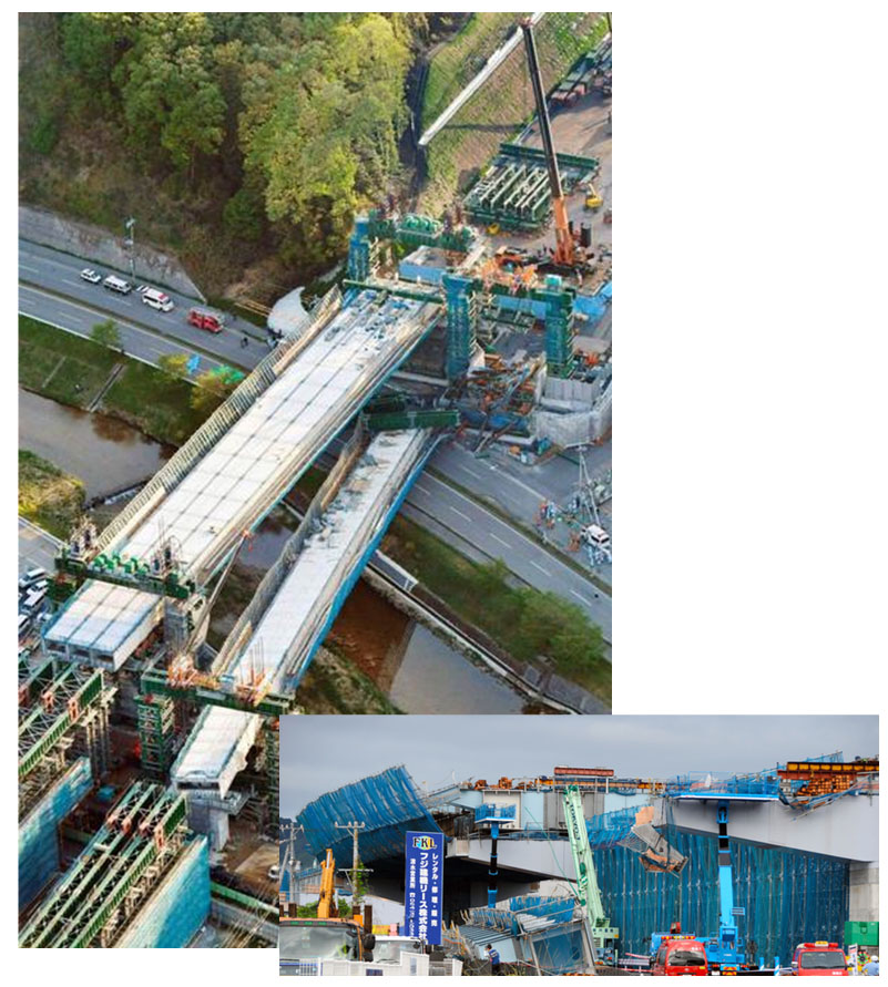 本稿では、「なぜ日本の橋は落ちないのか」という問いに対して、設計基準の厳格さ、施工段階の品質管理、維持管理制度の充実、そして安全を最優先する社会的合意の存在といったプラス要因について好意的に整理した。今回の種々の資料を基に行った分析した私の結論として、日本の橋は偶然に落ちないのではなく、長年にわたり多くの技術者によって積み上げられてきた制度と努力の結果として「落ちにくい仕組み」を持っていることが確認できた。しかしながら、「落ちない」という言葉に安住することは極めて危険である。構造物は完成の瞬間から劣化が始まり、気候変動の進行、激甚化する自然災害、さらには高度成長期に大量建設された橋梁群の老朽化といった課題は、我々技術者に不断の警鐘を鳴らしている。安全神話を前提とするのではなく、常に「落ちるかもしれない」という危機感を持ち、最新の知見や技術を活用して継続的な改善を図る姿勢こそが必要である。その理由として、我が国において工事中の仮設・架設段階では倒壊・落橋が多発している(図-9に示す新名神有馬川橋・2016年及び静清バイパス橋桁落下事故架設事故・2023年など)現状があげられる。橋梁架設・建設中の崩落事故発生は、鋼橋、コンクリート橋問わず発生しているが、これら発生の原因は人為的なミスの積み重ねである。一方、幸いなことに供用中橋梁の全体崩落は稀というのが実情である。