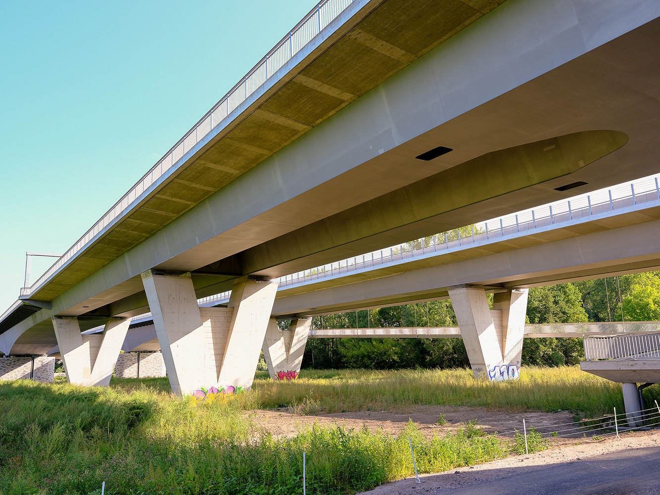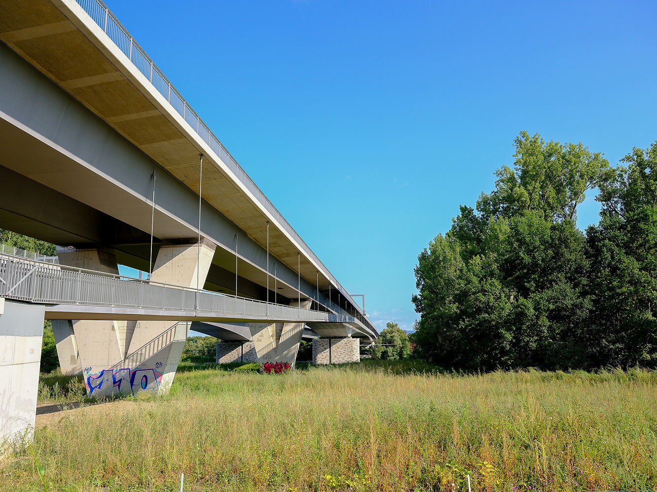 最初に紹介するのは、2025年度のドイツ橋梁建設賞1)の道路・鉄道橋部門の優秀賞を受賞したシーアシュタイン・ライン橋です。ドイツのマインツ(ラインラント=プファルツ州)とヴィースバーデン(ヘッセン州)を結ぶアウトバーン(A643高速道路)がライン川を渡る区間に架けられた橋です。