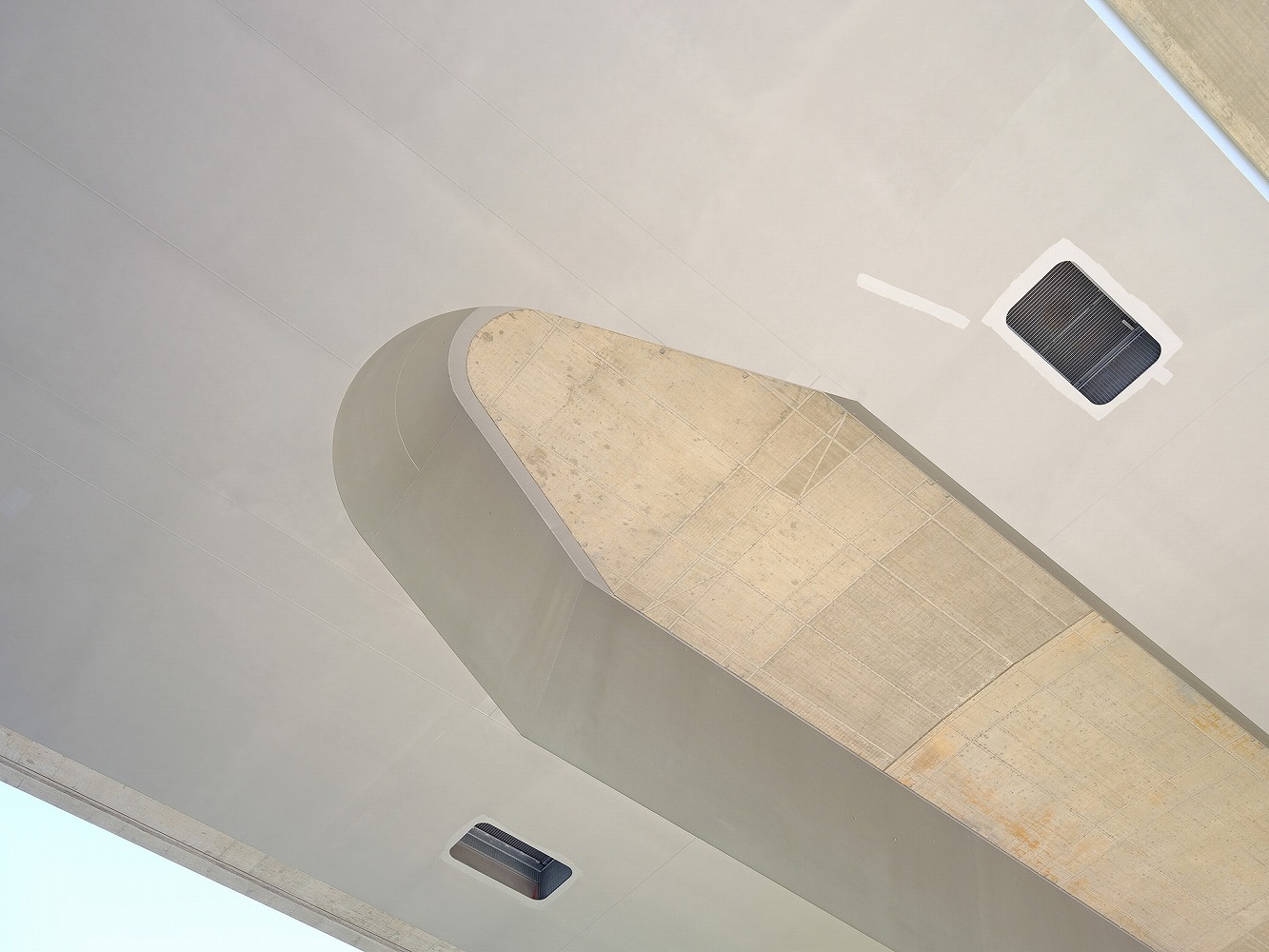写真3は、橋台付近の支間を撮影したものです。橋台に向かって2箱から1箱になるのですが、その変化も曲線でつないでいてきれいに仕上がっています。黒く見えるのは、桁内への進入路です(写真4)。