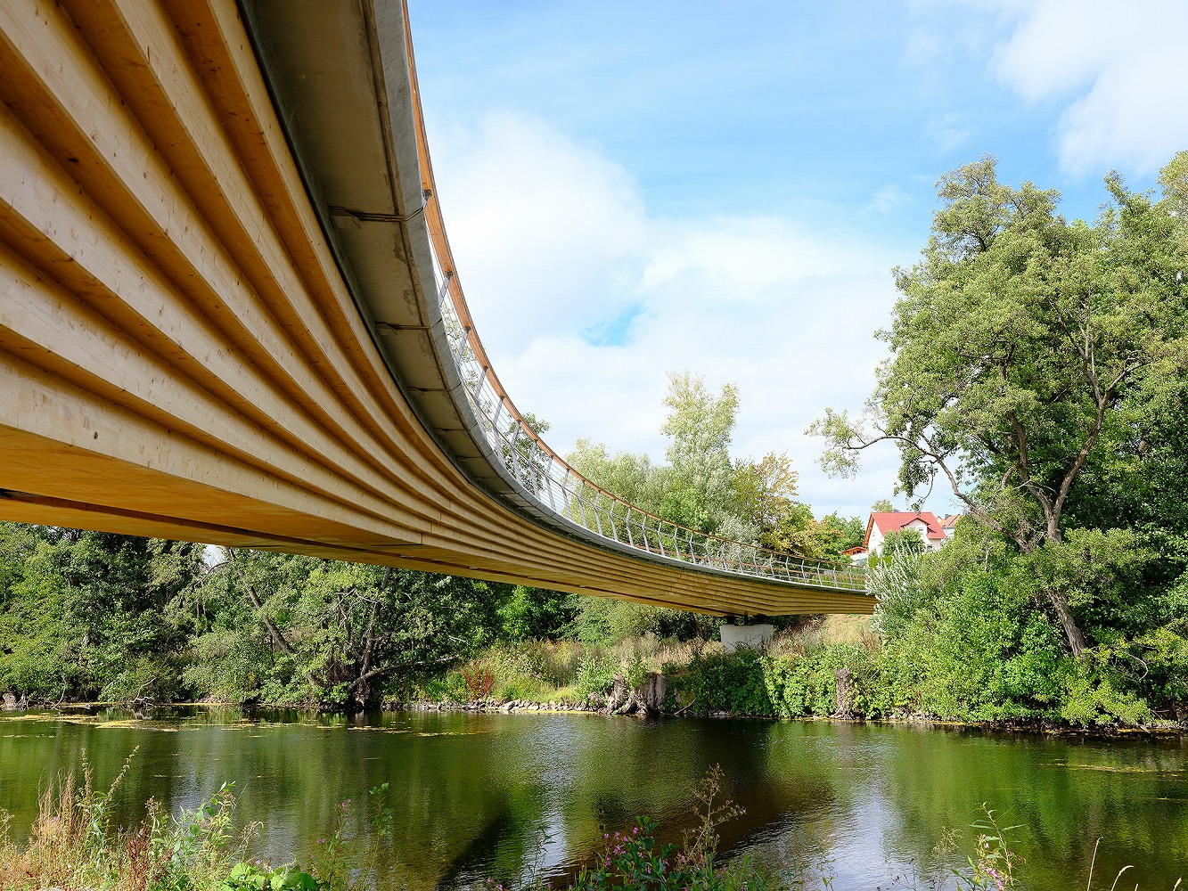 さてヨーロッパでも、カーボンニュートラルの流れのなかで木材への注目が高まっています。みなさまご存知のように、木材は、火と水には弱いものの、引張力にも圧縮力にもバランスよく強い材料です。3つの橋は、いずれも同じ構造をしていますので、ここでは曲線橋で最も長い橋を紹介します。