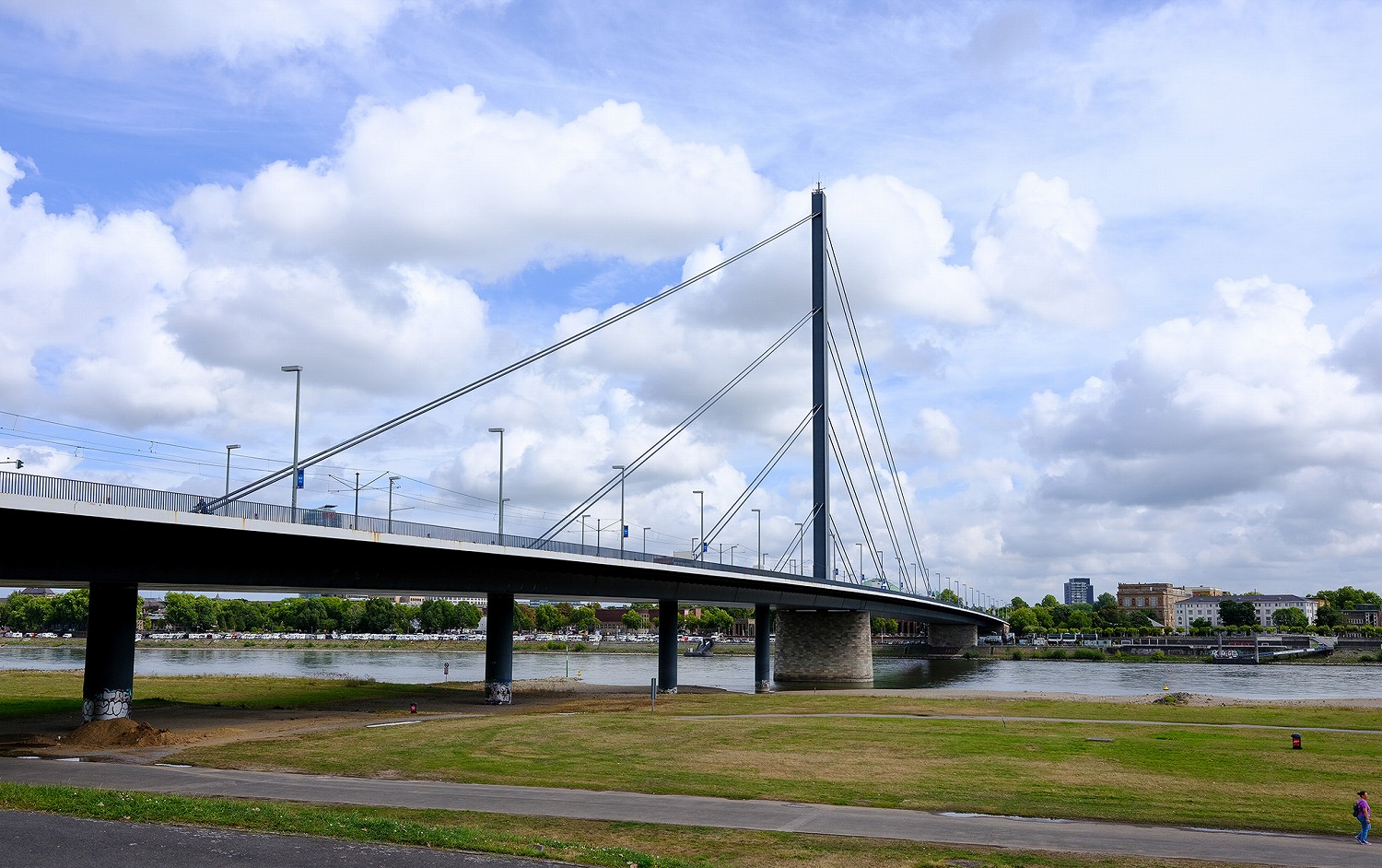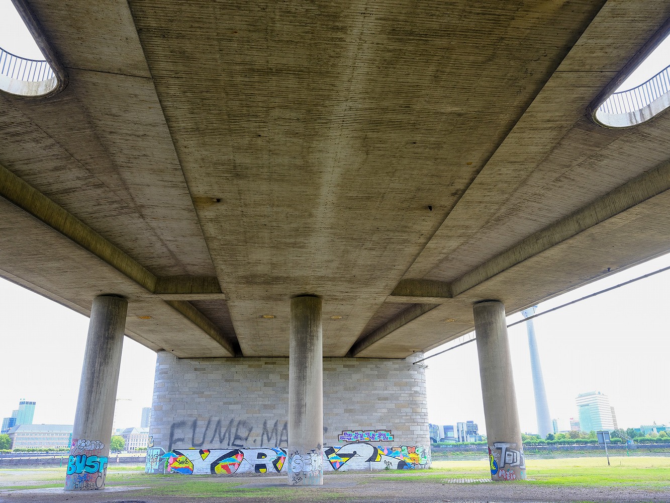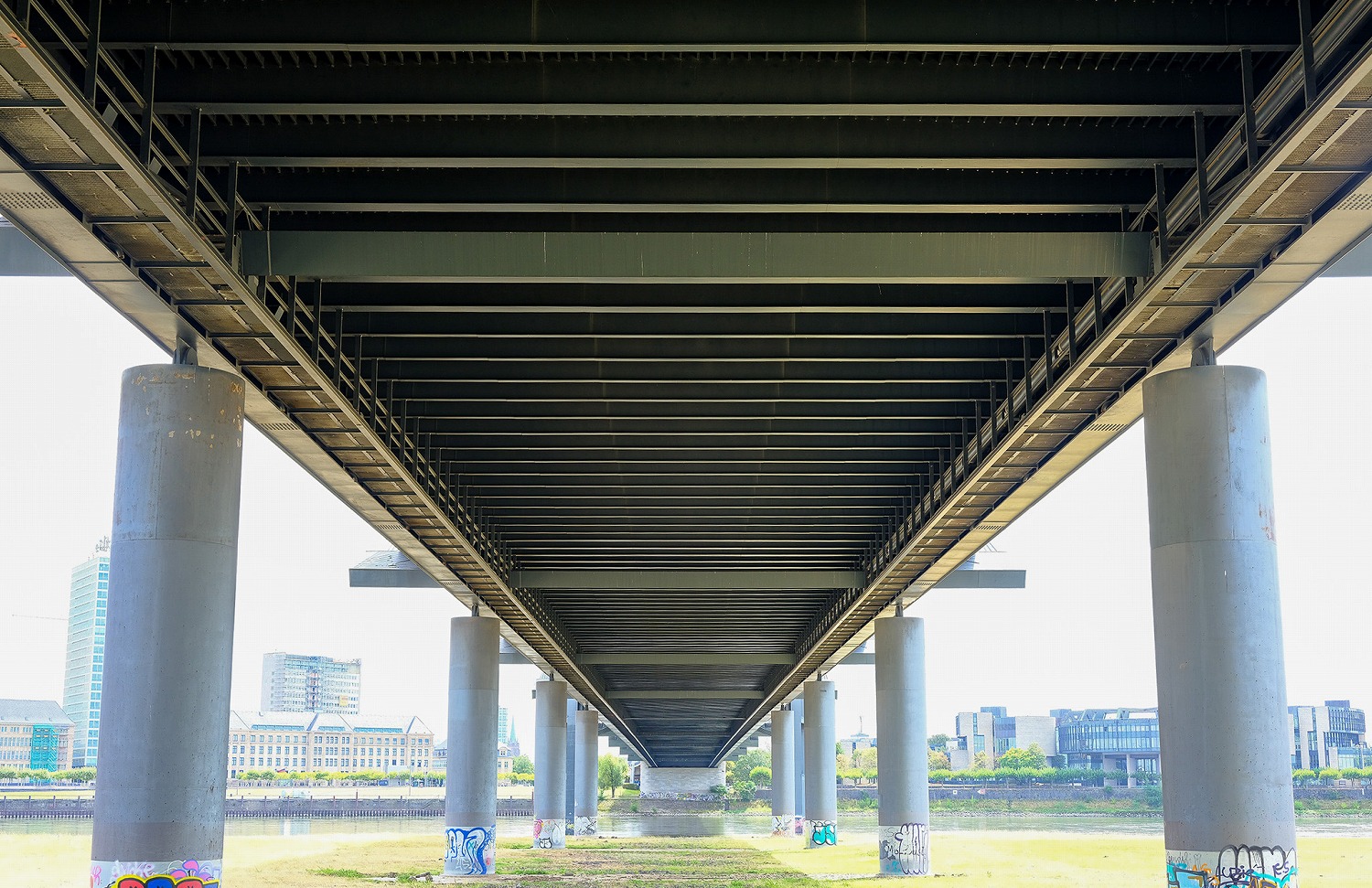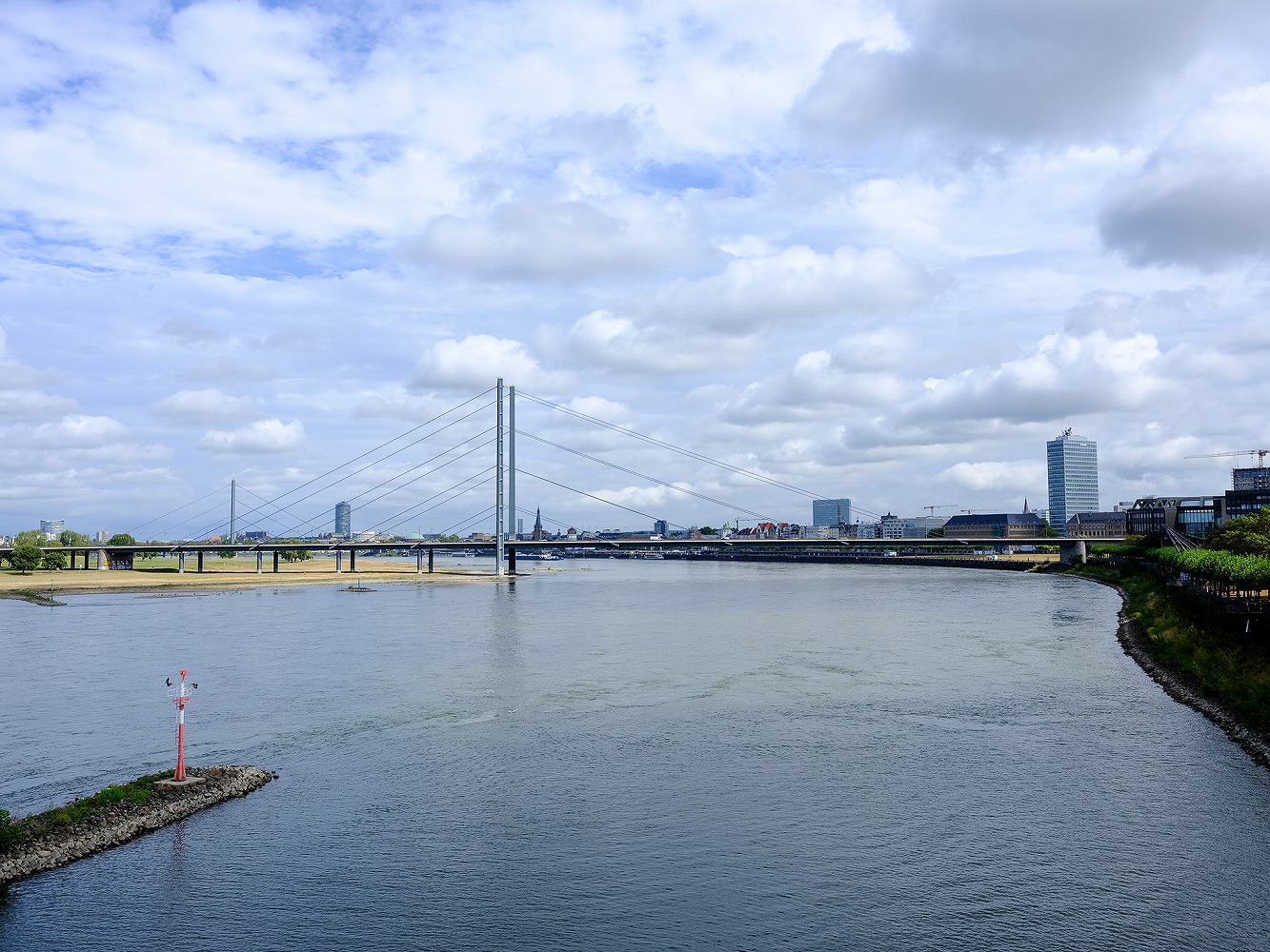 最後に紹介するのは、みなさんご存知のデュッセルドルフの斜張橋ファミリーです。世界最初の長大斜張橋で、上流から順に、テオドール・ホイス橋、オーバーカッセル橋、ラインクニー橋と並びます。1952年の計画当初から3橋セットで構想され、当時のデュッセルドルフ市都市計画局長だった建築家F.タムス氏のハープ型の斜張橋で揃えるアイディアが実施計画として採用されたようです3)。