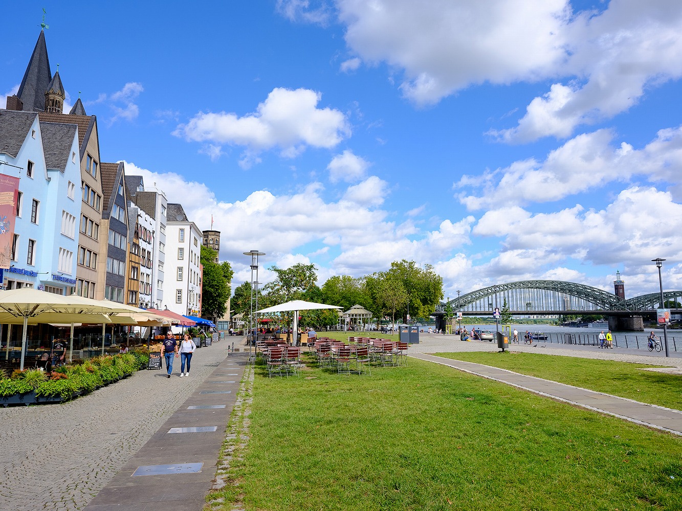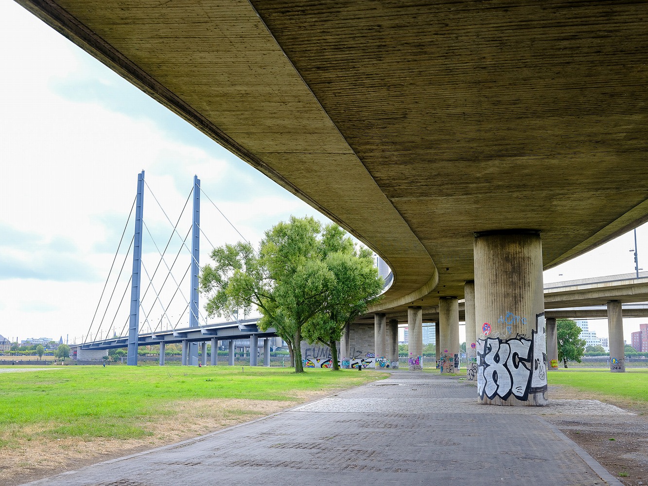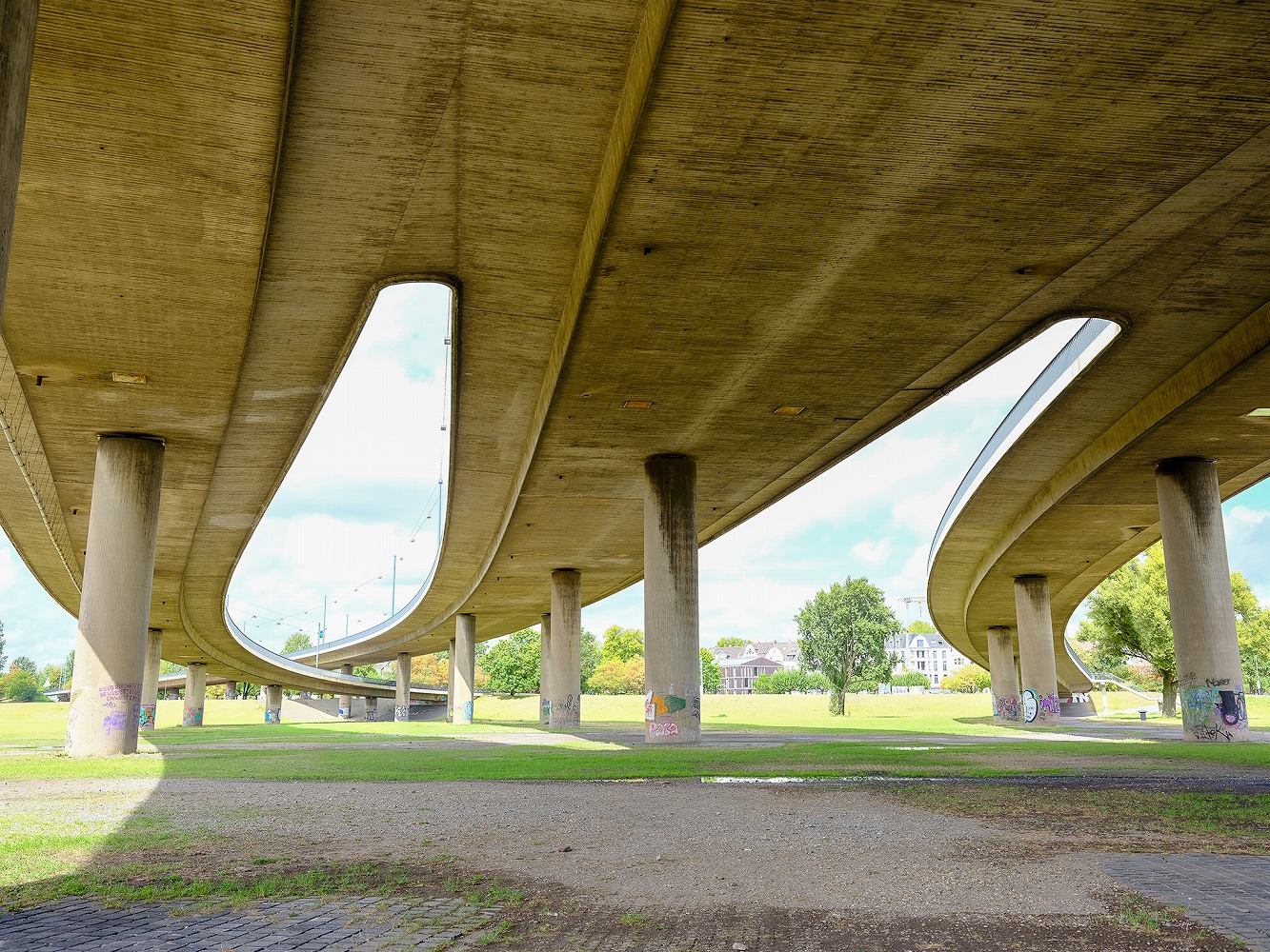 最後に、橋ではありませんが、車道地下化によるプロムナードについて紹介します。1984年にケルン市は、大聖堂にほど近いライン川左岸の国道の800m程度の区間を地下化し、ラインガルテンと呼ばれる河畔の公園を生み出しました。