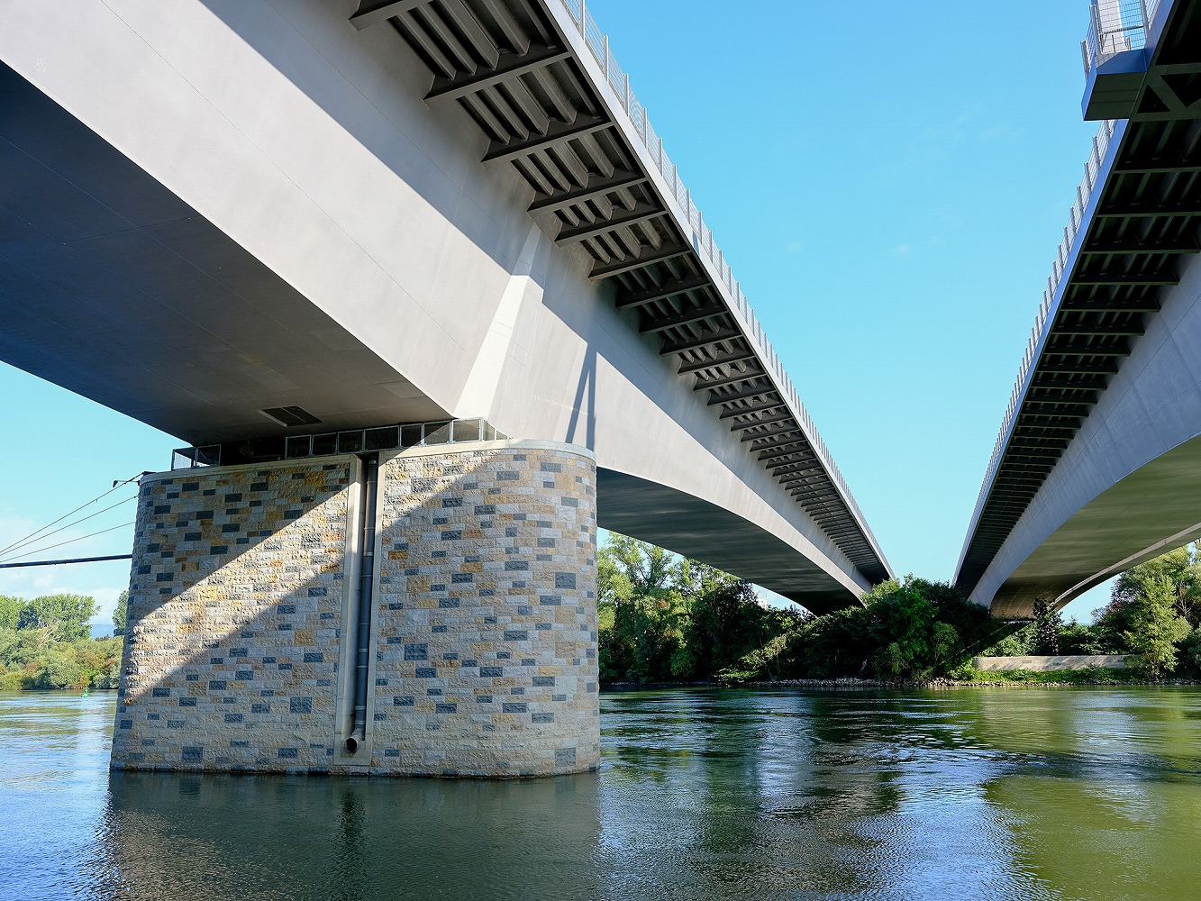 断面写真を掲載できないのが残念ですが、ウェブにもU型の縦リブが設けられていて、箱内部は前面にU型の縦リブがついています。箱桁内部はトラス構造を採用していてすっきりしています(多摩川スカイブリッジと同じです)。内部の様子が掲載されたスウェコのHPをリンクしますのでぜひご覧ください(https://www.sweco-gmbh.de/showroom/schiersteiner-bruecke/)。桁内の移動もしやすそうです。