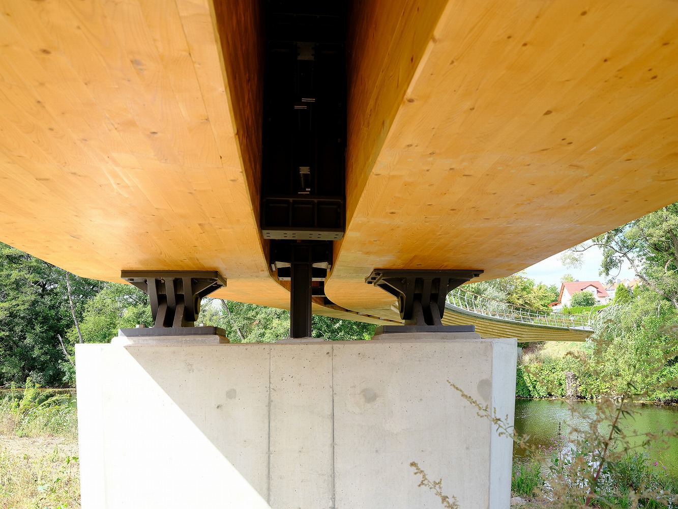 主桁は、正確には2本の木材ブロック桁で構成されており、両者は鋼部材で橋軸直角方向に緊結されています。また曲線橋のため、変位を制限する装置が橋脚に設けられています。
