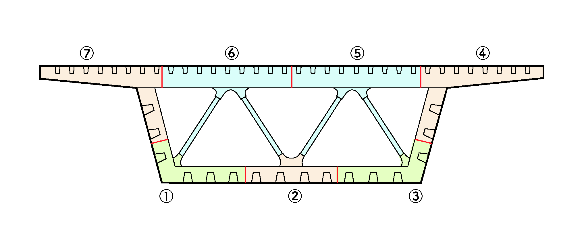 上部工の断面は、7つの部材を現場で溶接して製作しています。図1のように、下フランジの一部(中央)、下フランジの一部+ウェブ(下半分)が2つ、ウェブ(上半分)+張り出しが2つ、上フランジの中央部が2つの合計7つの部材です。施工では、まず下フランジの一部(中央)、下フランジの一部+ウェブ(下半分)の2つを施工し、その後、残りを組み立てていくようです。施工のわかりやすい動画をリンクします。(https://www.schiersteinerbruecke.de/bauablauf/)