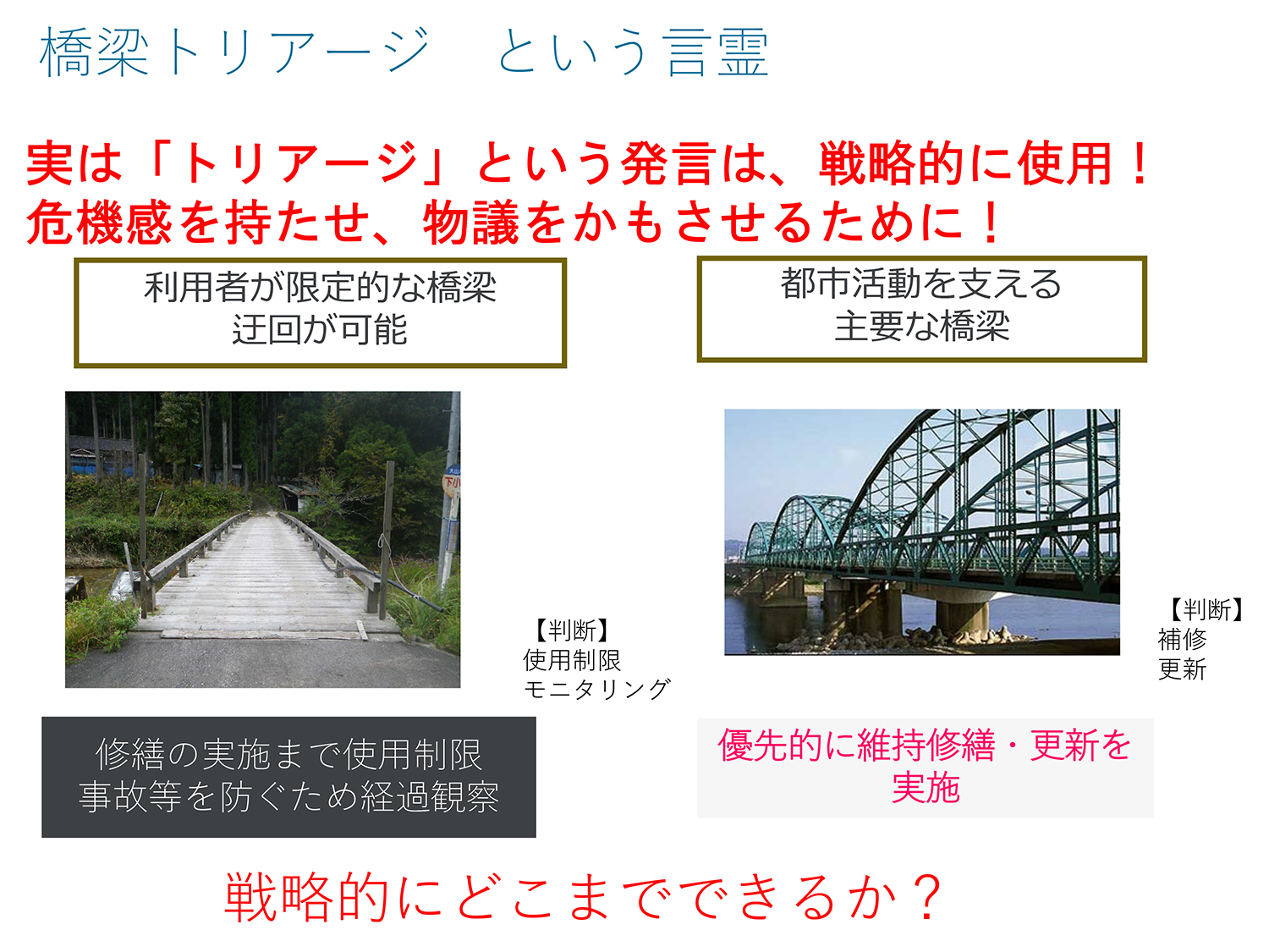トリアージや補修オリンピック、などは私の発想である。これを批判した人たちも多い。しかし、世の中はそういう方向になってしまった。これは、マネジメントというものを真剣に考え、世の中の状況を分析すれば明らかな話なので。それが、わからないと言うことは、マネジメントが向かない。マネジメントができないと言うことである。先が読めていない。マネジメントは、物事の先を読むことも重要である。