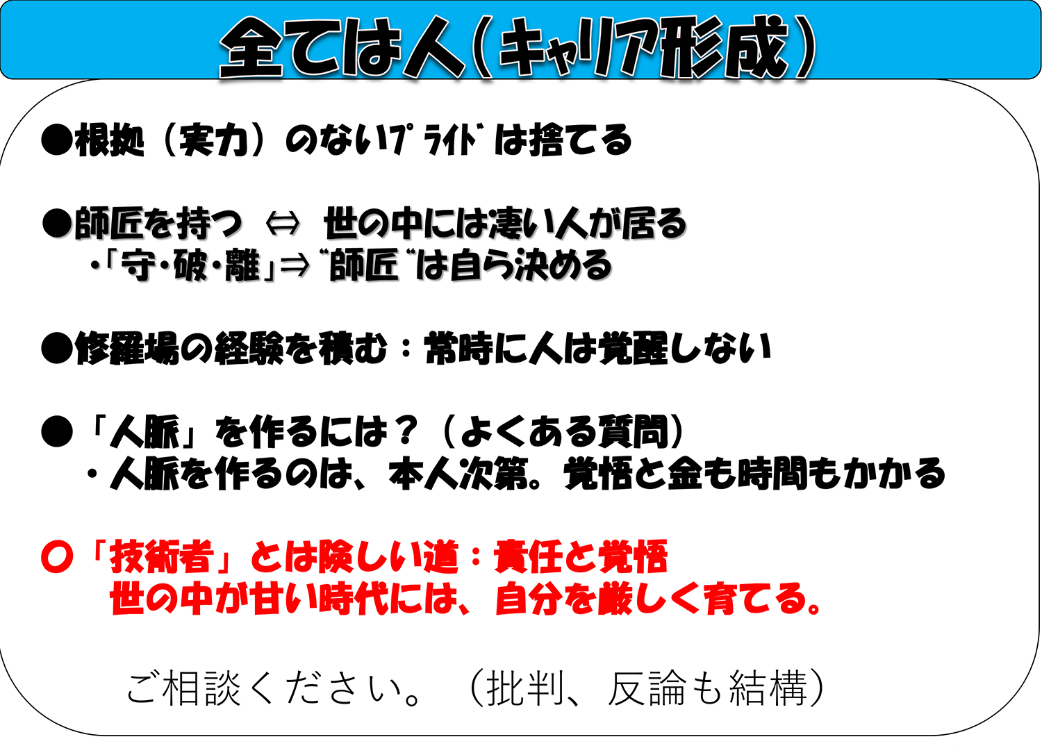最近、良く言われるのが、「最近の人たち勉強してないね。」ということである。私も気になっている。学校の勉強ができた、とか、偏差値が良いと言う話ではなく、自分が何が必要でどう調べるか?という課題である。現在はインターネットで簡単に検索できる。ある程度のことは分かる。しかし、それを本気で願うならば、スペシャリストに聞くことだと思う。これがだれか?という問題もある。誰に聞けばよいのか、周りに居ない場合はどうすればよいのか?それは本人の工夫次第である。役割分担というものがある。それぞれの立場で考えることも異なる。やるべき音も異なる。これは、官・学・民で、それぞれ役割もやるべきことも違って当たり前だ。これを同じようにやろうとするからおかしなことになる。