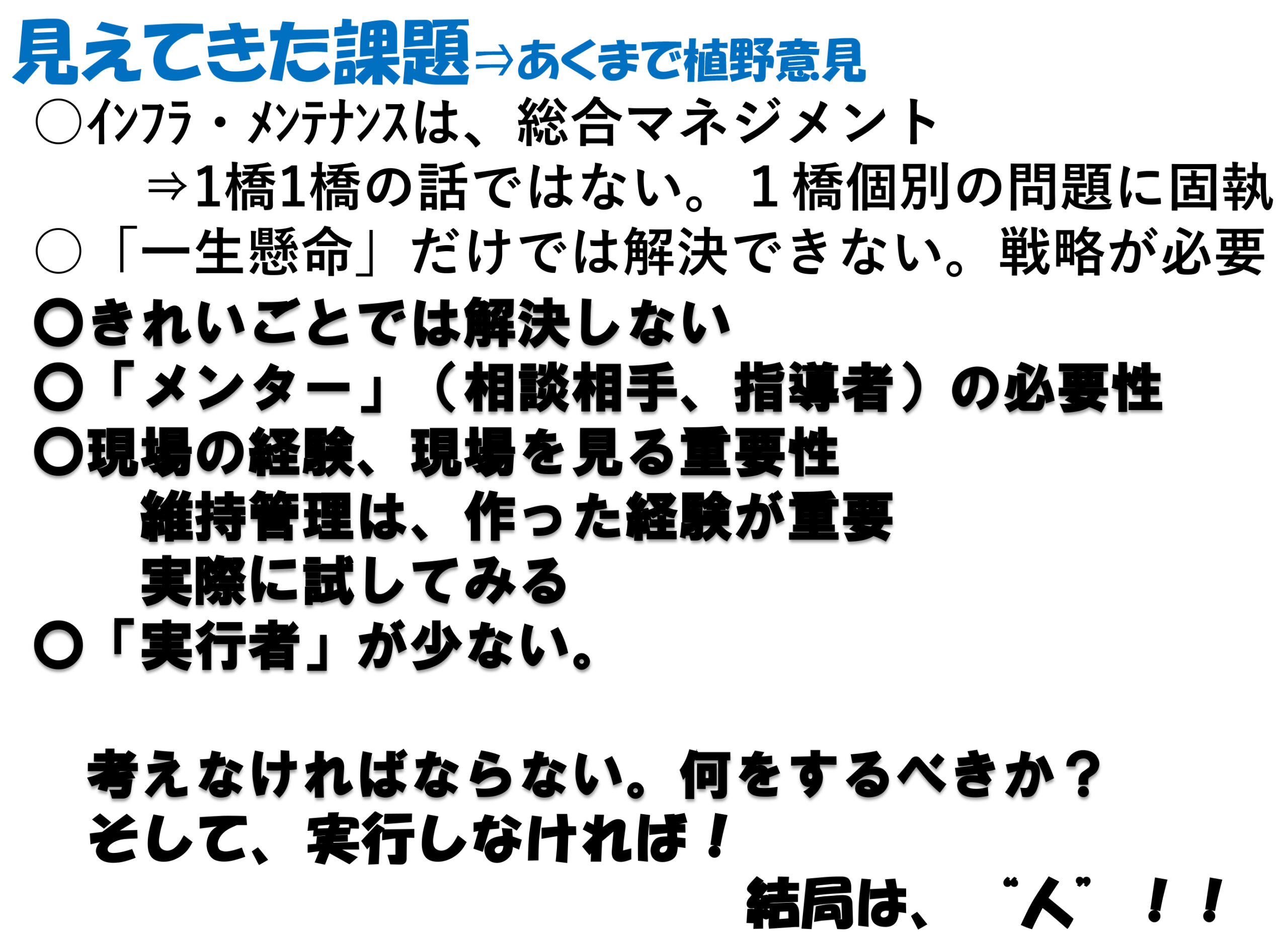 私は、実務者である。他分野のことにも興味はあるが、やるべきことは違う。これまで、特に橋梁に関して、幅広い知識と経験を積もうといろんなことをやってきた。システム開発や新技術、新事業、非破壊検査も学んだ。そして新たなマネジメントとしてインフラのPFI事業も経験見した。実務者にとって一番の勉強は、自分で経験することである。