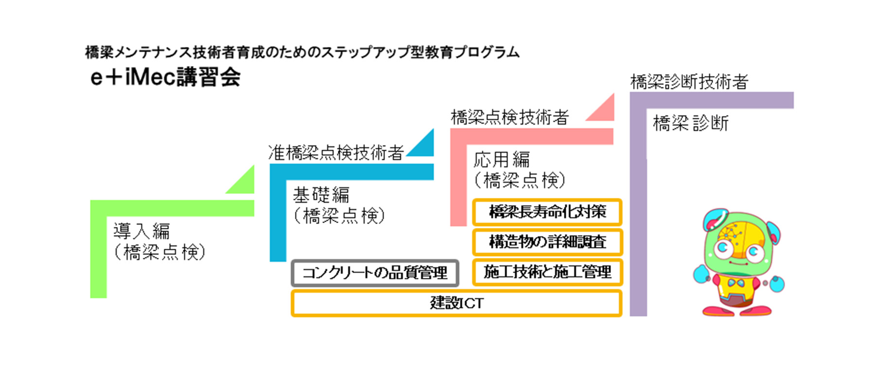 KOSEN-REIMでは橋梁メンテナンスに関するリカレント教育プログラムとして、図1に示すように、「橋梁メンテナンス技術者育成のためのステップアップ型教育プログラム」体系の構築に取り組んできました(連載第1回参照)。「橋梁診断」を受講するには4つの「専門特修講座」である「施工技術と施工管理(連載第7回参照)」「構造物の詳細調査」「橋梁長寿命化対策(連載第14回参照)」「建設ICT」を先に受講する必要があります。今後は、デジタル技術を駆使していくことが必要となるので、橋梁診断技術者が備えるべき建設ICTに関する基礎知識、および橋梁メンテナンス実務でICTを活用するために必要な知識の修得を目的とした「建設ICT」を今回は紹介します。