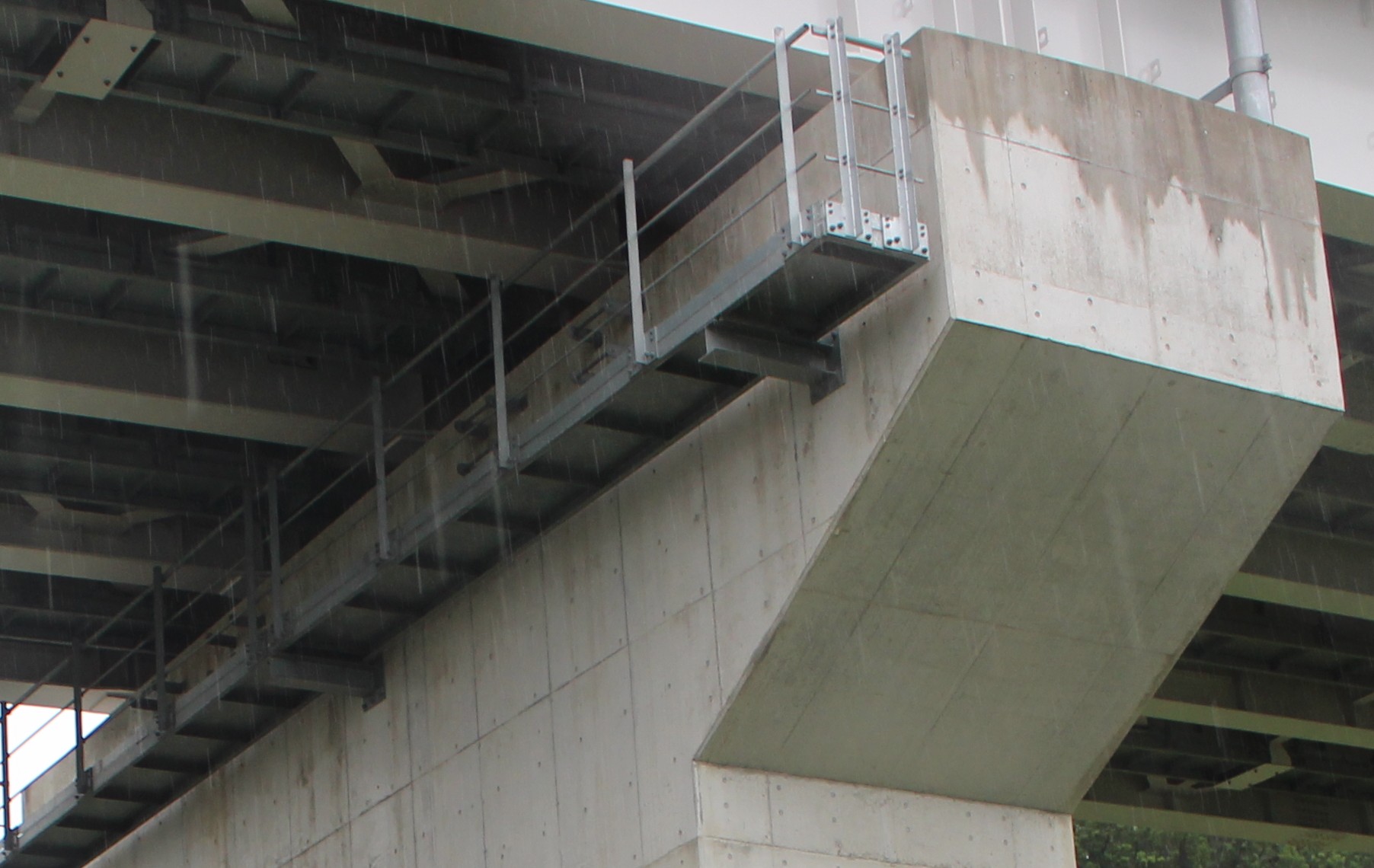 コンクリートが密実であればこうした不具合のリスクは小さいので、密実となっているかについては、ここで何度か紹介しておりますが、雨天時にコンクリートがどのように濡れるかによって、表層品質の傾向がある程度掴めるかと思いますので紹介します。写真を見ると分り易いですが、密実なコンクリート(写真-5)は水が侵入できず弾かれて直線的に下へ流れています。逆に空隙が大きいコンクリート(写真-6)は、水を一定量吸収し飽和状態となってから下方へ流れようとします。水が下方向に流れる速度はコンクリートの空隙が大きいほど遅く、そうした状況は目視で確認できます。ご興味がある方はご自分で施工状況を確認したコンクリートで観察いただけたら良く理解できるかと思います。