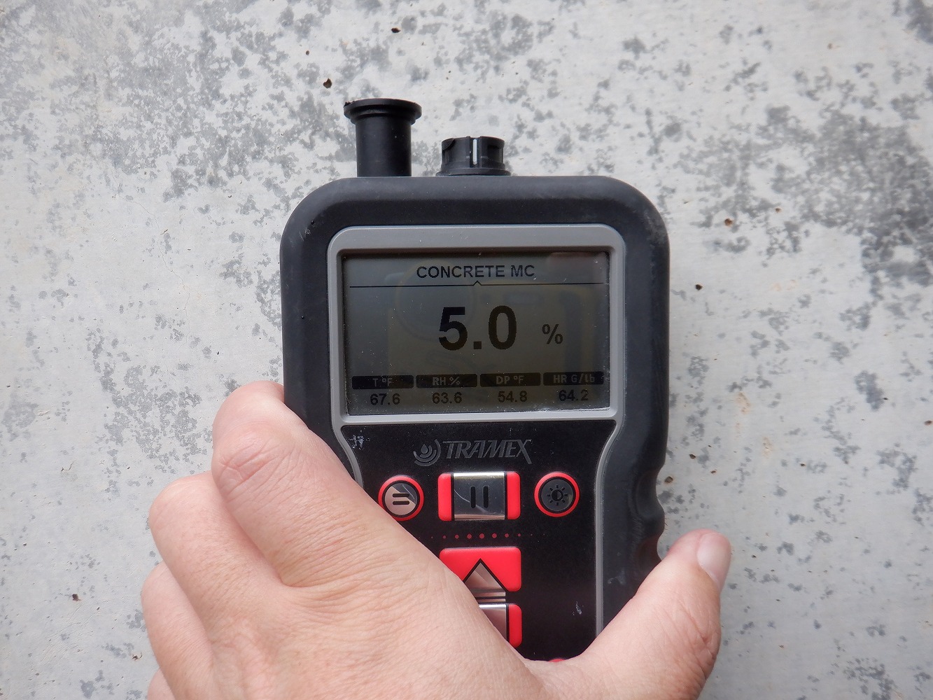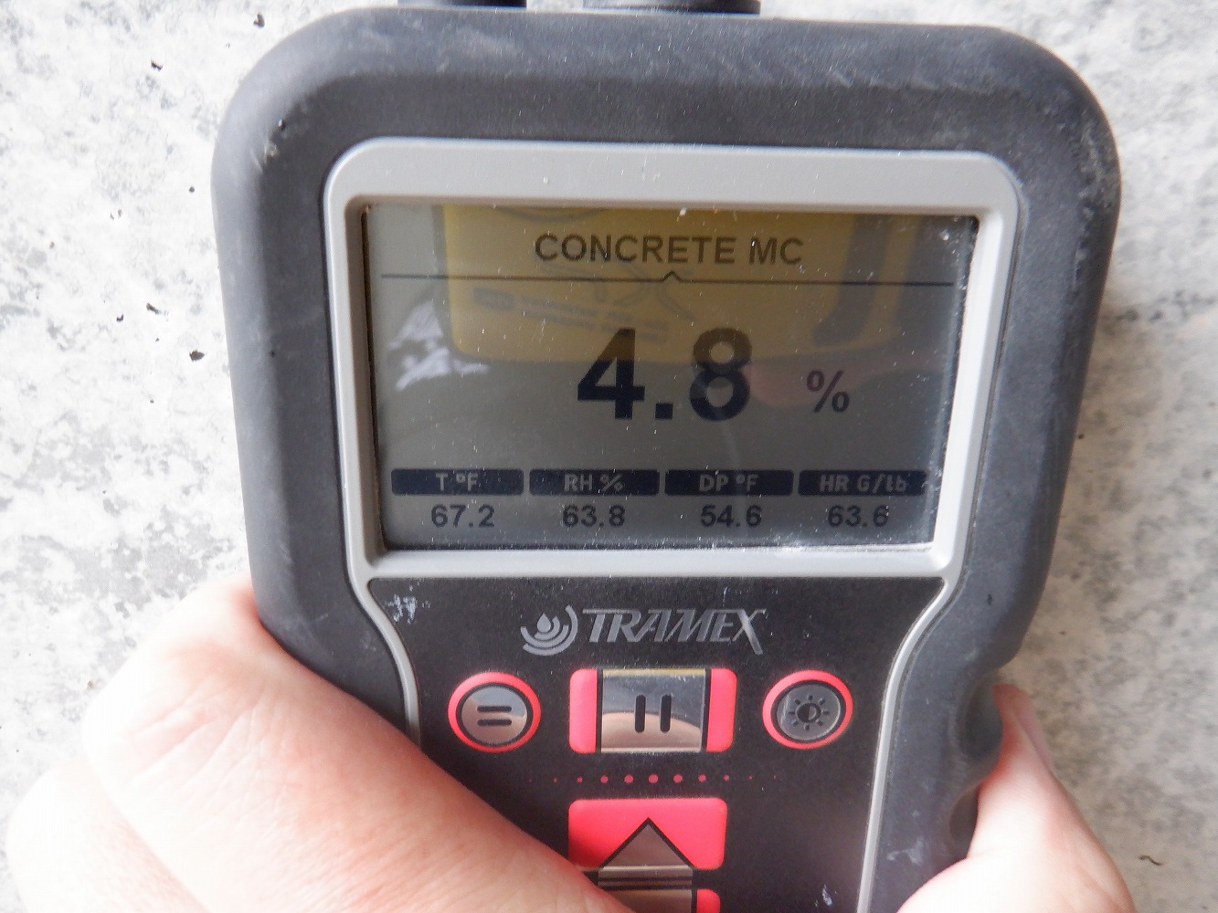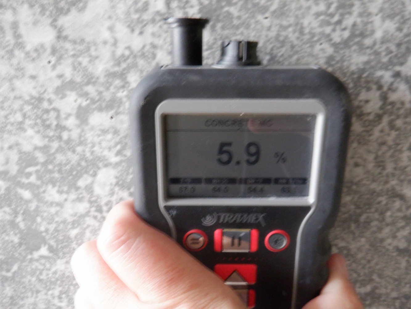 通常、ボックス内側の水分は日光が当たらない事もあり、含水率が下がりにくい傾向(複数箇所で確認)がありますので、こうした乾燥収縮によるひび割れは年数が経過してから顕在化すると考えておりました。このような若い構造物で顕在化した場合、これからひび割れは成長するだろうと思います。参考までに完成から1年半経過したあたりで、ボックスカルバートの出口付近で含水率を無作為に5箇所計測(写真9~13)したところ、4.8~5.9%でしたのでこれから乾燥し駆体は収縮しますので、今後もひび割れが拡大傾向であるのは想像できると思います。