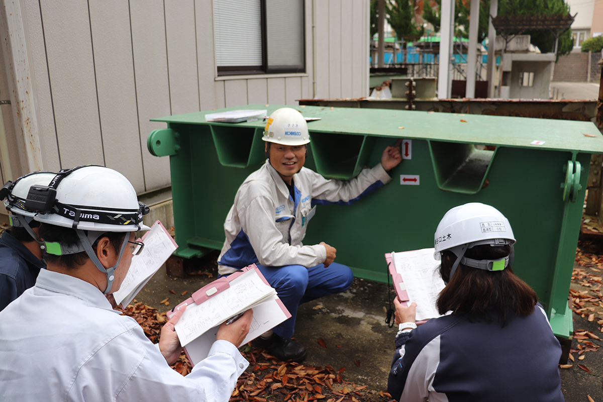 次に、疲労亀裂の生じやすい部分と亀裂の入り方についてiMec内の実物劣化教材を用いた体験型学習を行います。写真1はUリブを使用した鋼床版を対象にした実習の様子です。受講者には生じ得る応力の方向を矢印マグネットで、その応力により発生する亀裂の位置に細切りにしたマグネットでそれぞれ貼ってもらいます。そして、「溶接継手の疲労強度等級分類」(継手の種類、応力方向により疲労強度を等級分けしたもので日本鋼構造協会疲労設計指針に示されている)中のどの等級に該当するか検討します。これらを通して、一般的に疲労亀裂が入りやすい溶接継手形状や応力条件を理解してもらいます。