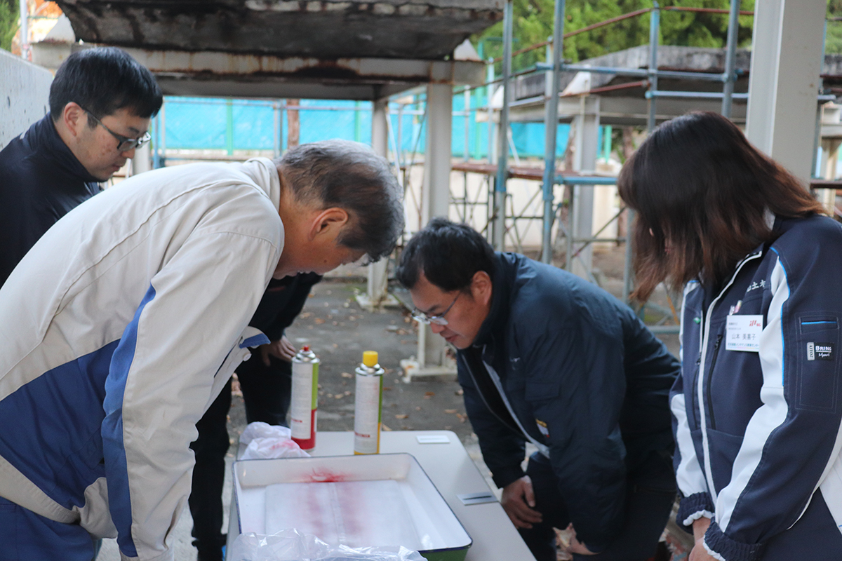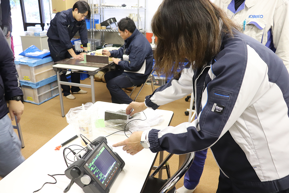 本講座の受講者には鋼構造物よりコンクリート構造物の点検経験が豊富な方が多いので、とても興味深く鋼構造物の非破壊検査を体験しています(写真2、3、4)。