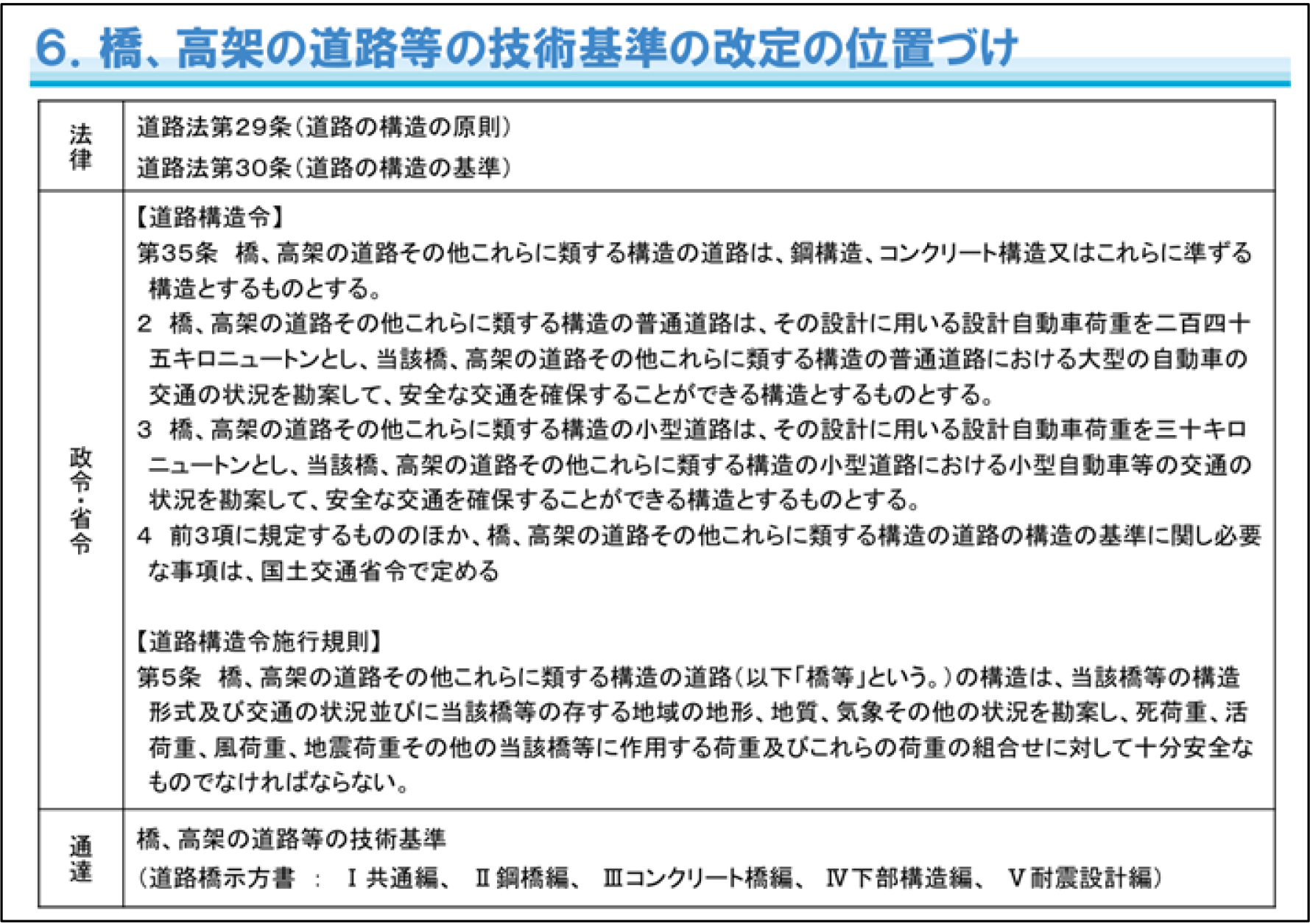 そもそも「橋、高架の道路等の技術基準」とは、正式名称は、「道路構造物に関する技術基準(橋、高架の道路等)」であり、国土交通省が省令として定める 法規(最低限の技術基準) である。法的な位置づけは、道路法第30条 に基づく「技術基準」であり、法律の下に位置する省令レベルの遵守することが必須の基準で我が国の全ての道路管理者(国・都道府県・市区町村・高速道路会社)はこの基準を満たす必要がある。