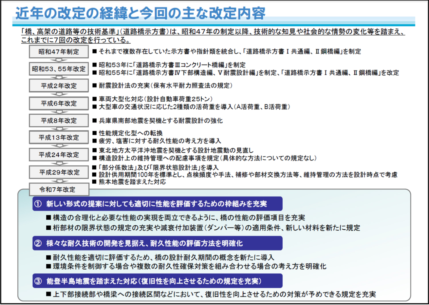 今回行われた改定の主な目的は、安全性のさらなる向上、技術開発・新技術導入の促進、ライフサイクルコスト(LCC)縮減/長寿命化対応などである。