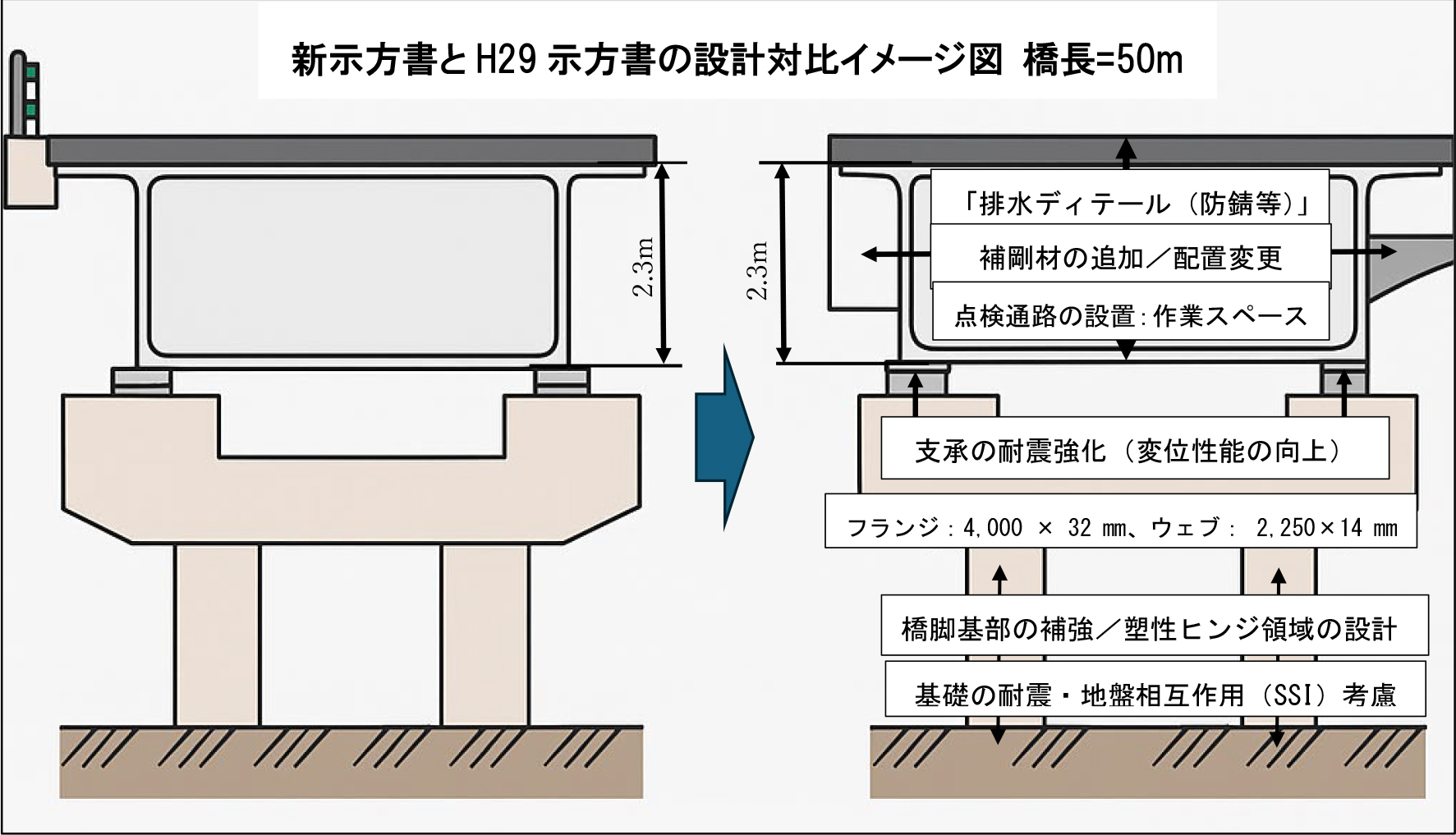 併せて、同一主桁を対象に、サービス状態のたわみ・振動、疲労照査、局部座屈・横座屈、合成効果の照査、温度・施工段階荷重の検討が必要となる。それ以外にも、床版・横構等や附属物等の詳細設計が求められる。新たな「示方書」とH29年版「示方書」とを対比した結果を表‐2に示す。