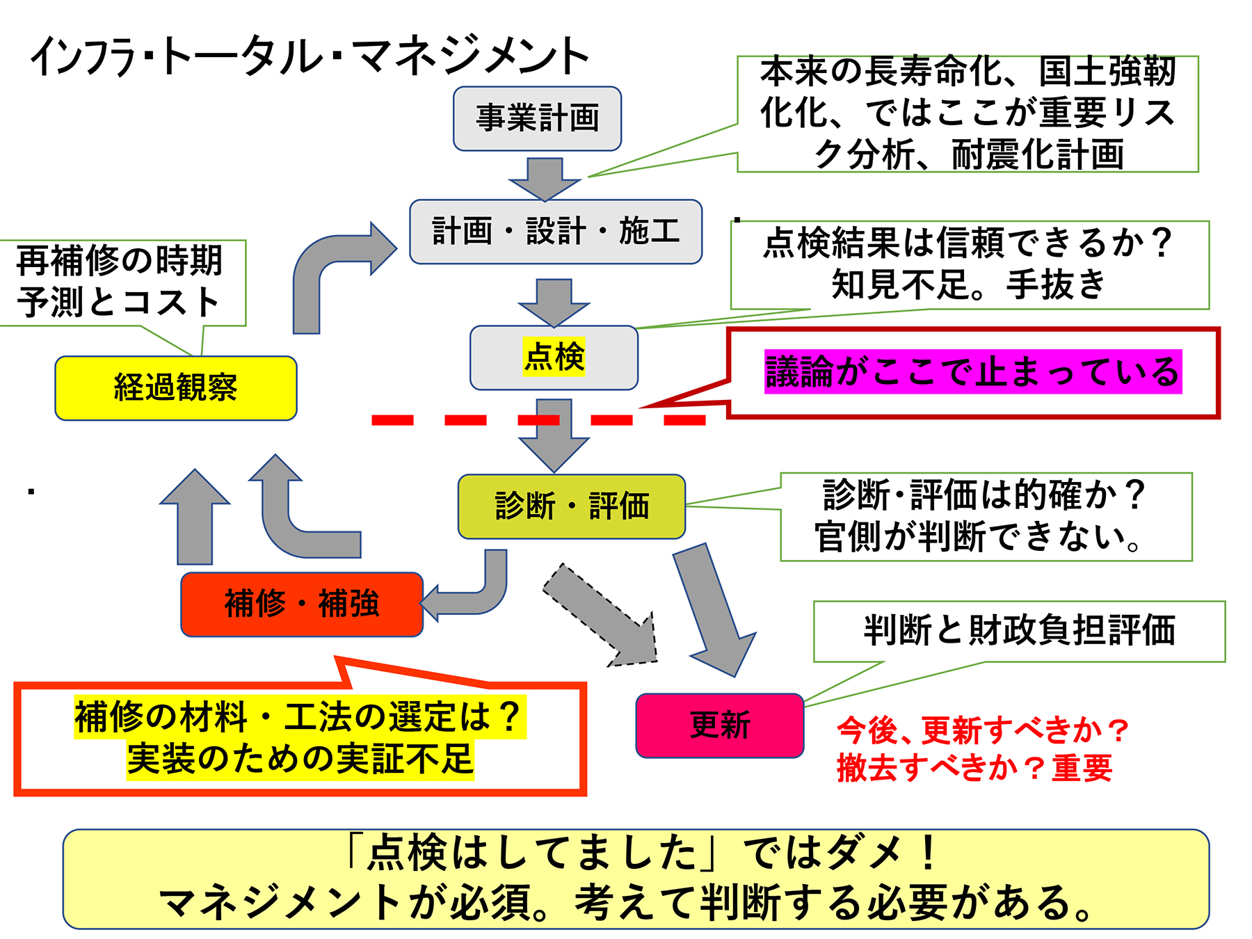国では、新たな委員会が始まりました。「インフラマネジメント戦略小委員会」です。蒼々たるメンバーで、私など末席でビビってます。(笑い)審議会の下なので急いで諮問に関する答えを出さないといけないようです。ということはこれまで言ってきたように、インフラ問題は、予断を許さない状況に来ていると言うことです。