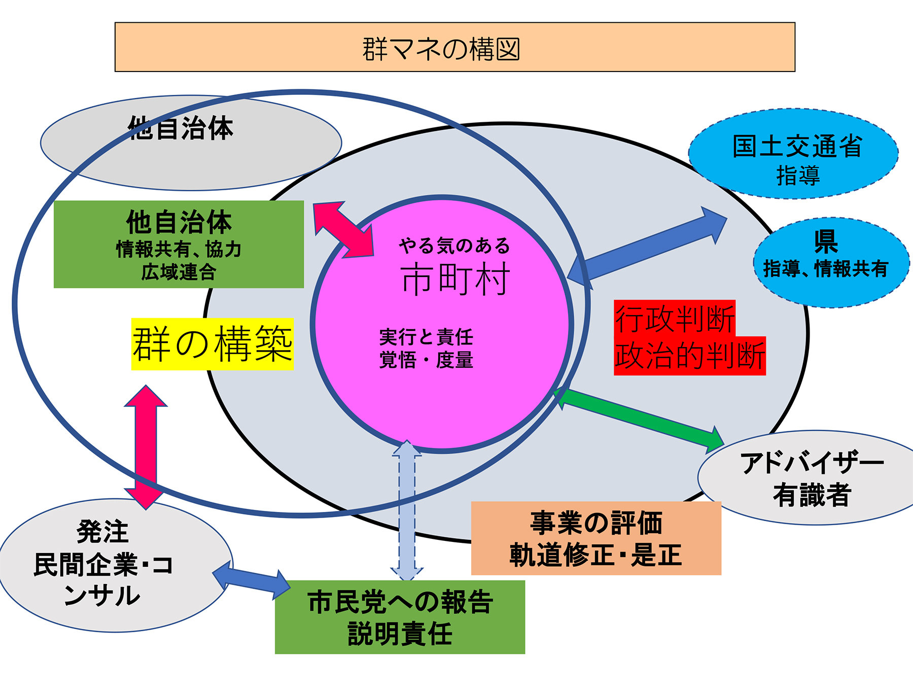 今、群マネが旬であるが、これをやるには十分な協議が必要である。まずは官側の意志である。何をどうやろうと言う意思がなければ、できない。できないと言うよりも何をやったらよいかわからないはずである。そして協議をして決めていかねばならないが、どうも大手コンサルの中には単なる、「行政支援」のつもりでいるところがあるようである。それではうまくいかない。「お任せ定食」となってしまう。行政側は、「ラーメンが食いたい」(山口県の中越君の売り言葉かります!)のかもしれない。これでは、出来上がったものでは満足はできない。意思決定は、行政側の仕事であって、いくら大手でも優秀だと思っていても、民間側の仕事ではない。さらにはその後には、政治決定というものがある。行政は行政で、最終的には思い通りにはならない。政治的判断が入る。