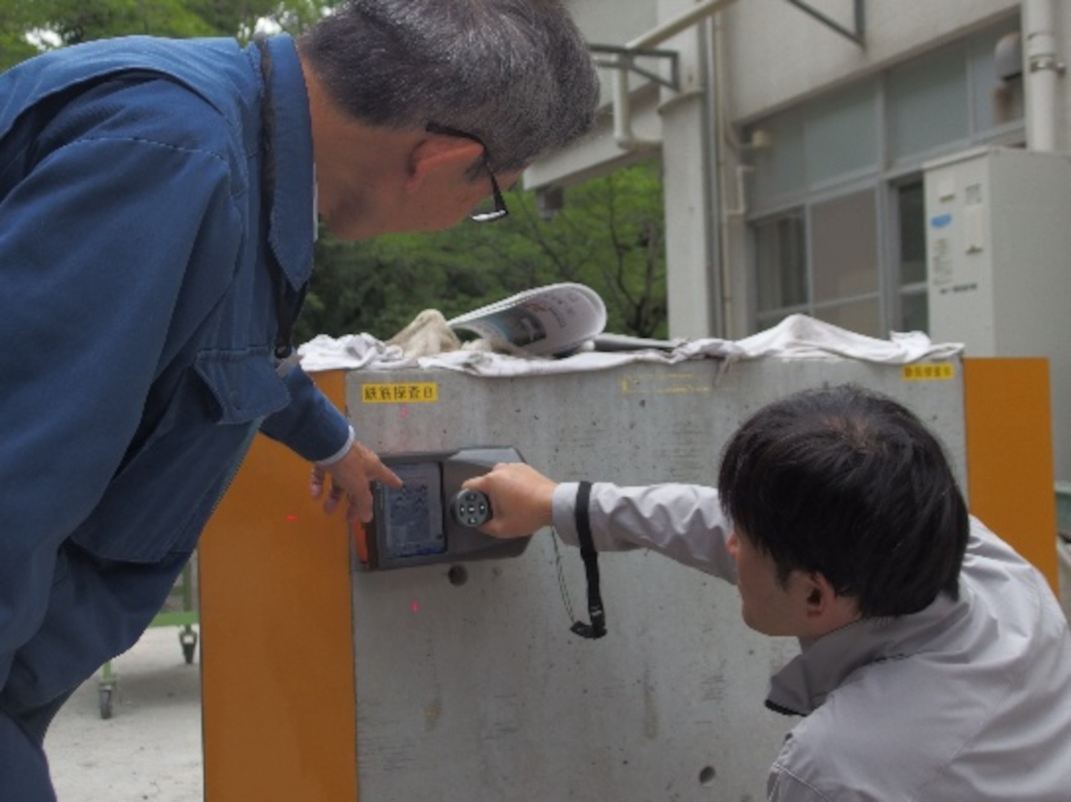 学内では電磁波レーダーによる鉄筋探査、テストハンマーによる強度推定、打音検査、中性化深さ測定など、鉄筋コンクリート構造物について一連の非破壊検査も体験します。