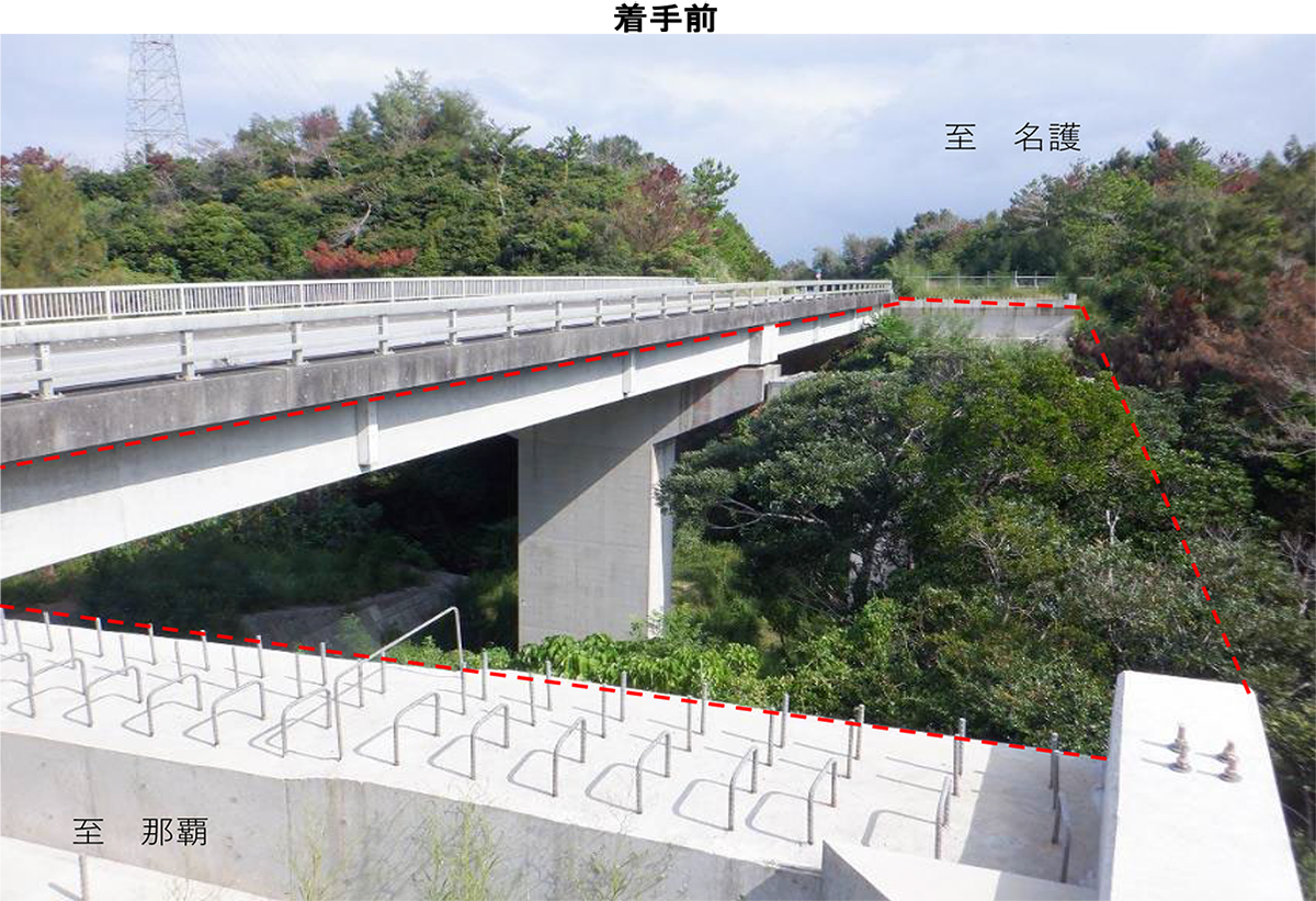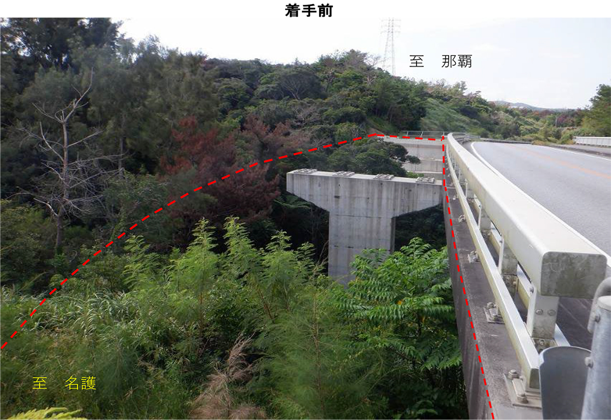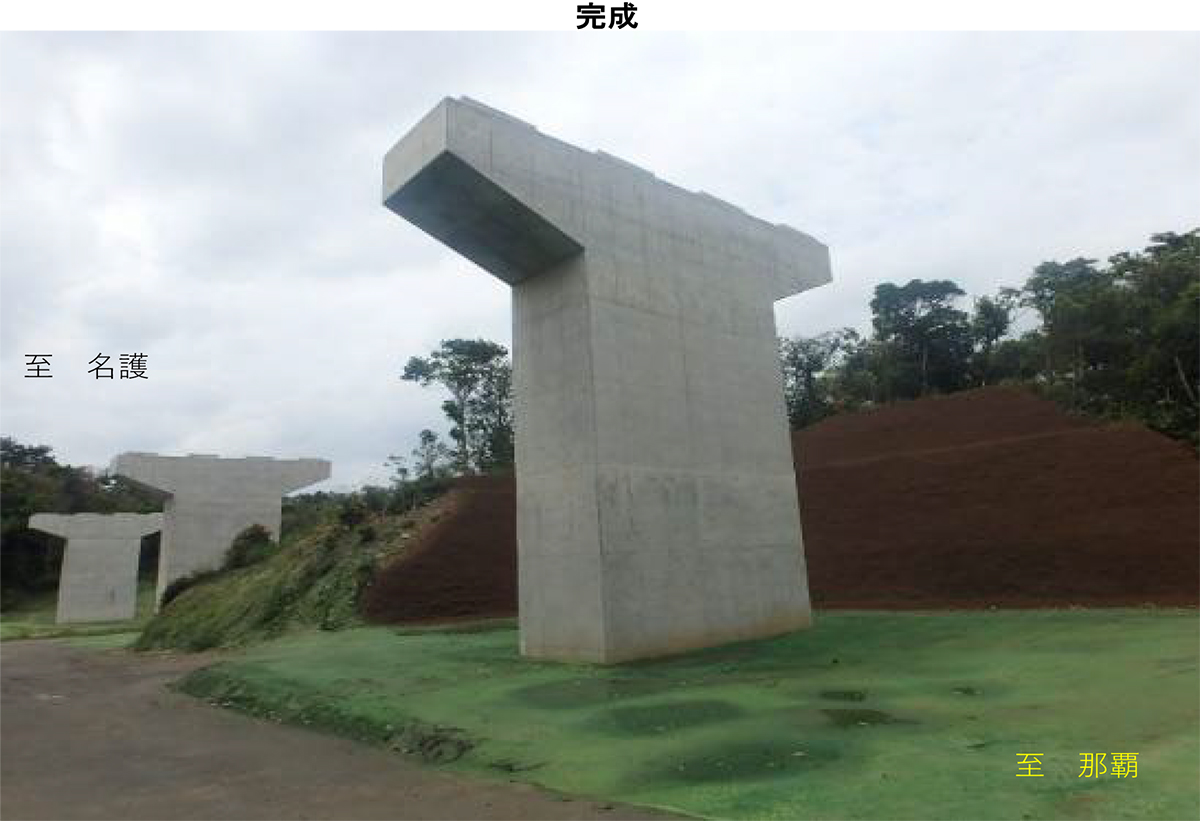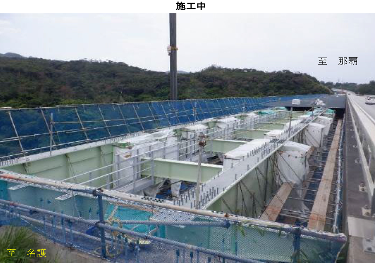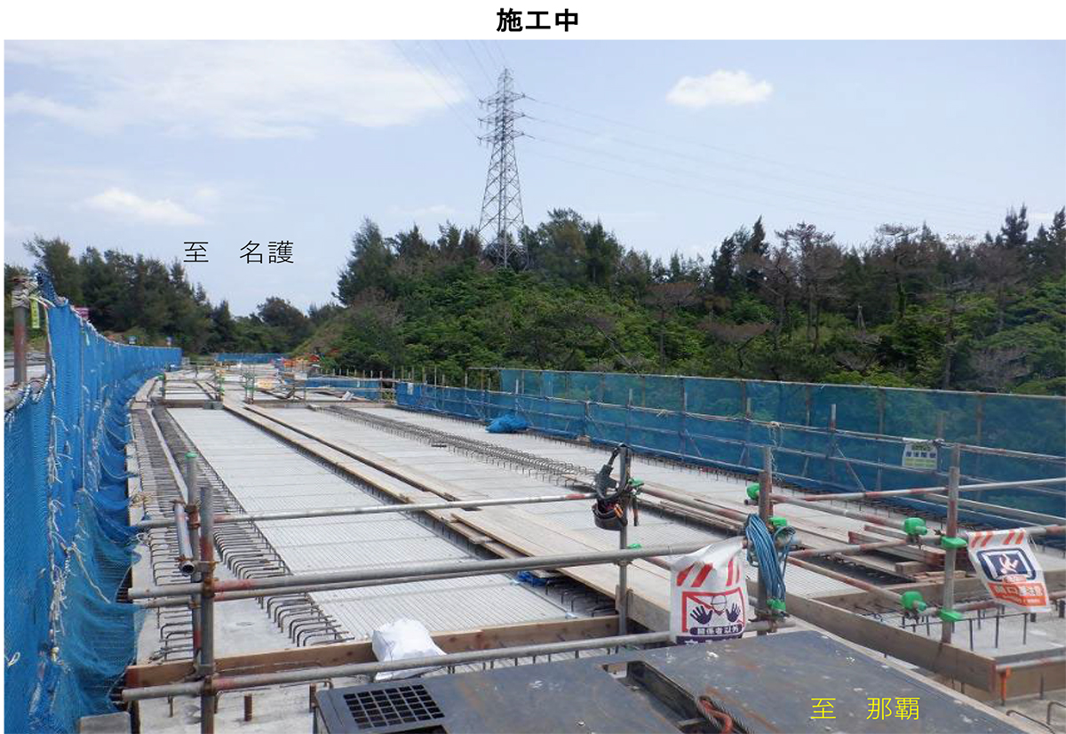屋我 恩納村瀬良垣~同村南恩納に至る延長約5.1kmの4車線道路で、観光シーズンや休日の渋滞緩和、交通安全の確保および沿道環境の向上を図ることを目的とした道路事業です。2011年4月には全線を暫定2車線で供用しています。現在は、改良工事、橋梁上部工事を実施しています。