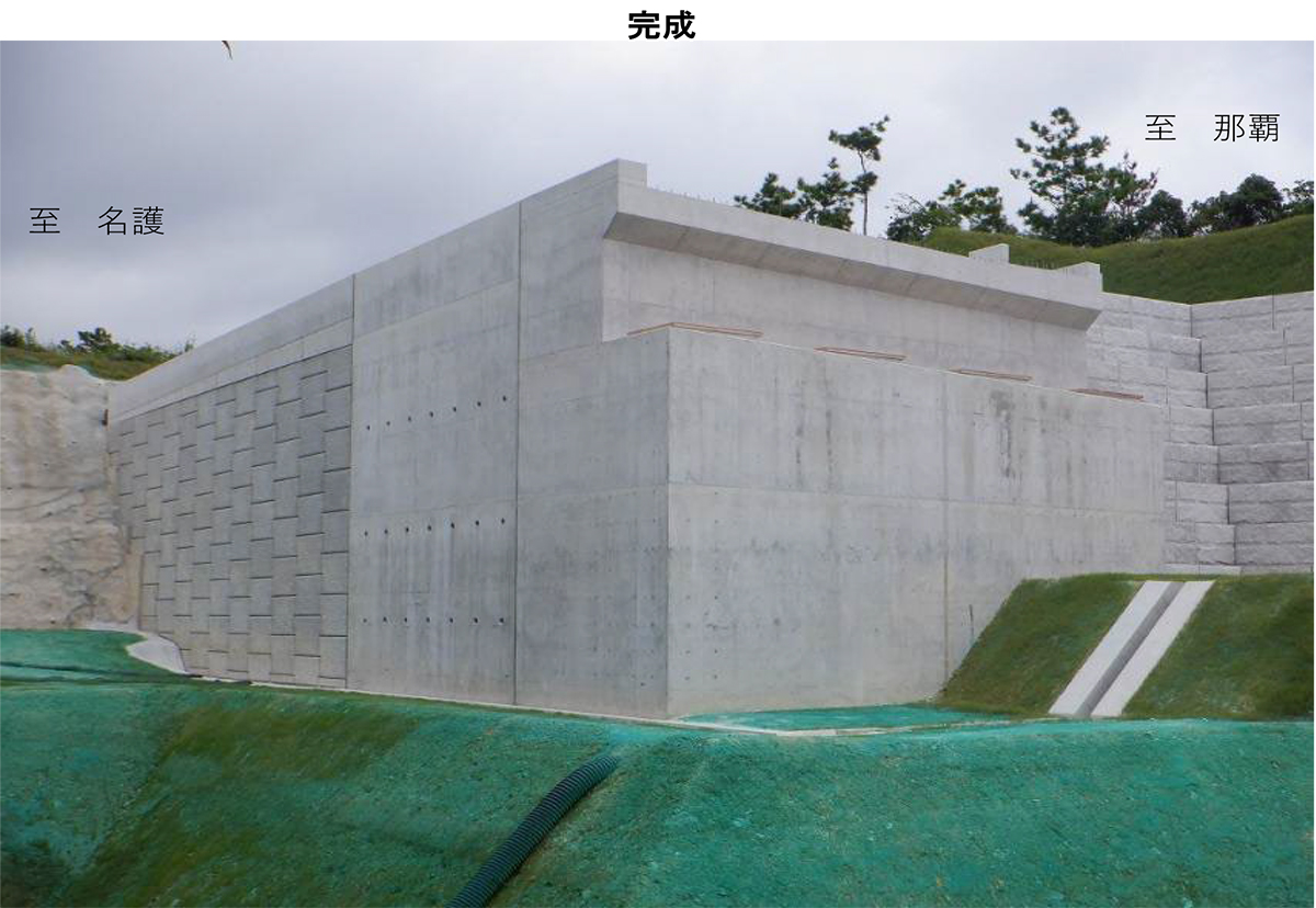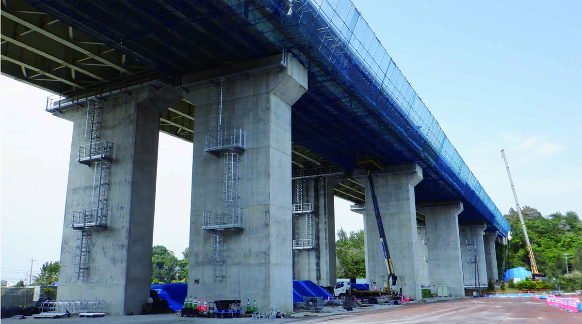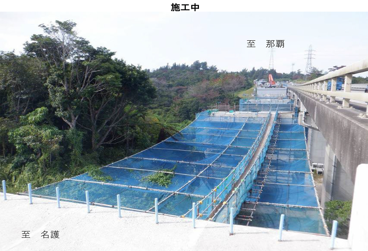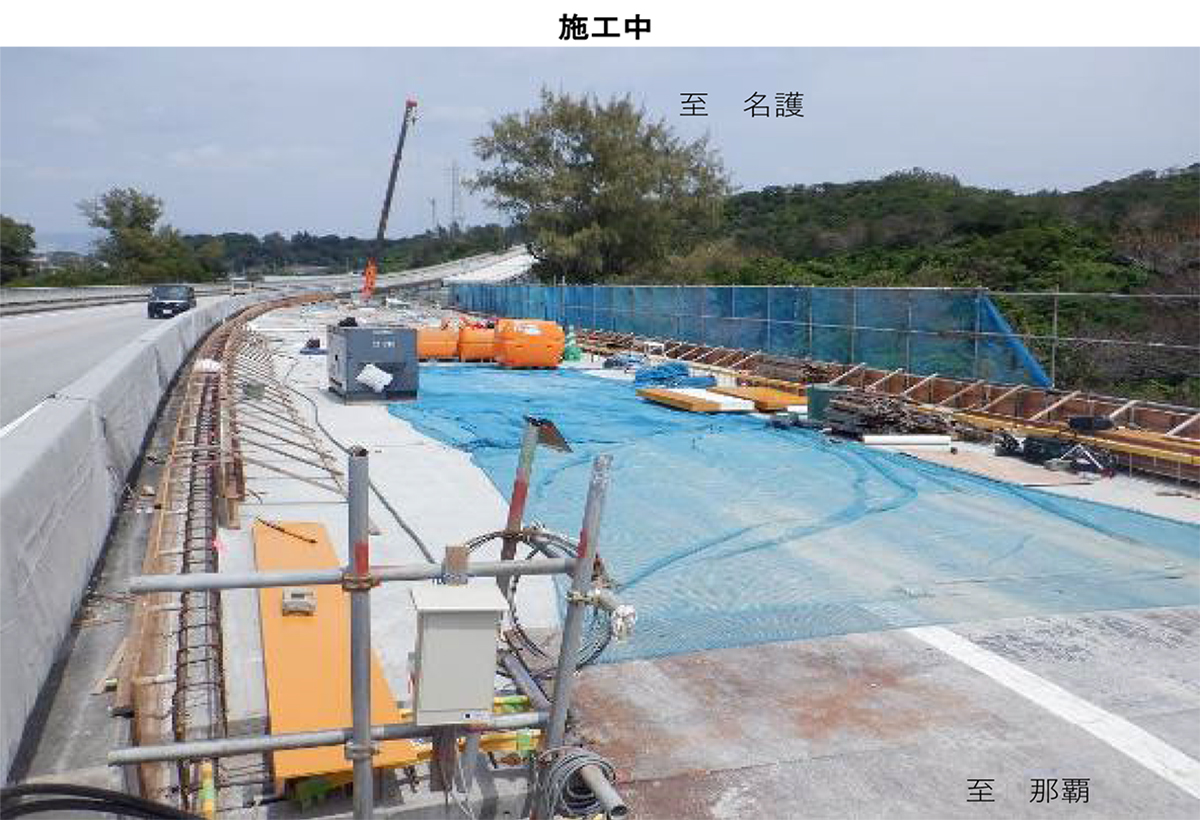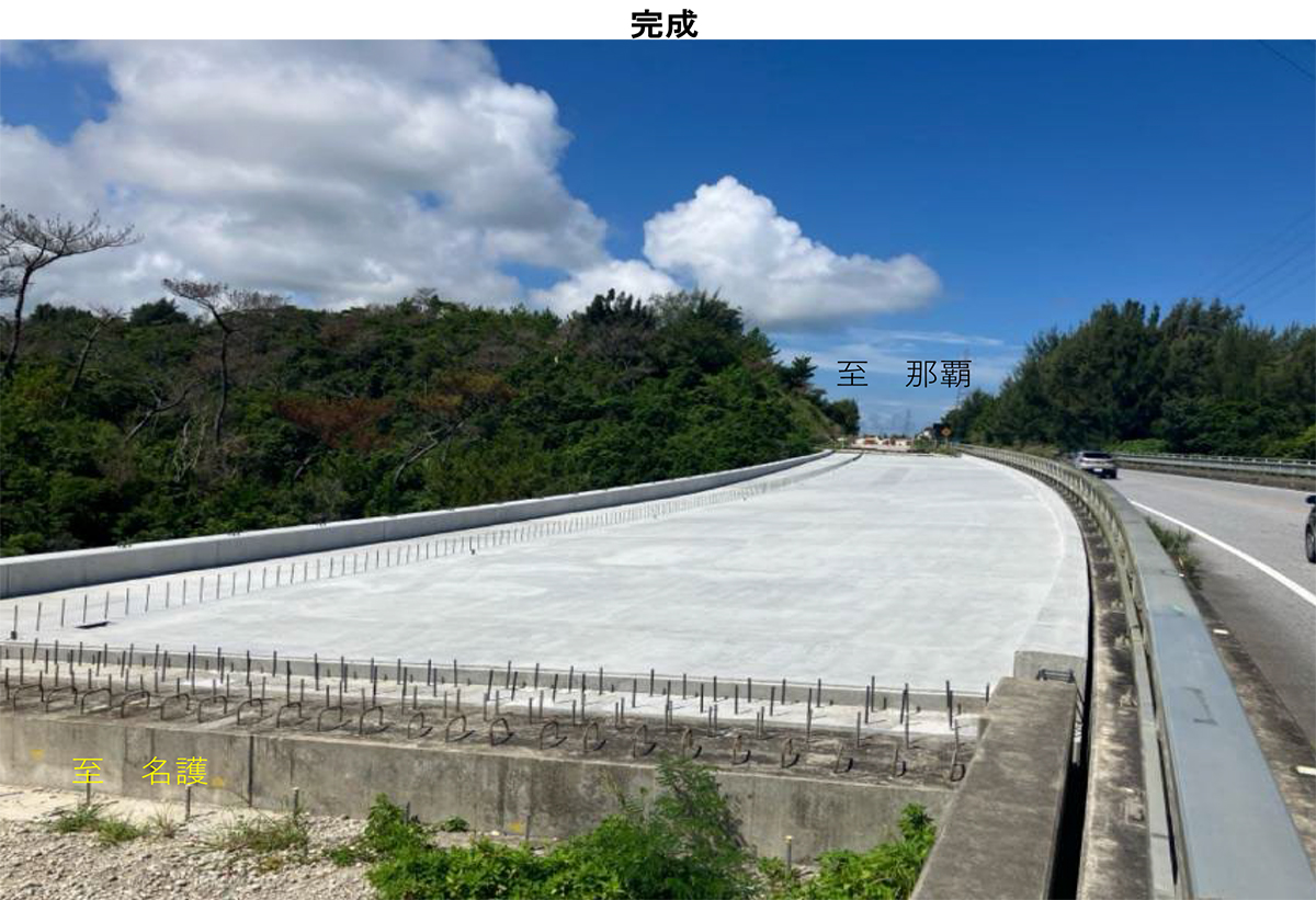 屋我 恩納村南恩納~同村仲泊に至る延長約6.5kmの4車線道路で、観光シーズンや休日の渋滞緩和、交通安全の確保および沿道環境の向上を図ることを目的とした道路事業です。2018年3月に全線暫定2車線供用しています。また、恩納南バイパスの事業進捗率は事業費ベースで約97%となっております。橋梁区間が約0.9km(14%)となっています。現在は橋梁、土工とも完了しており、最終段階として舗装工事を実施しております。舗装工事と合わせてⅠ期線の山側切土のり面が流れ盤となっていることからの最終点検も併せて行っており、必要に応じてアンカー工などの安全対策を実施します。