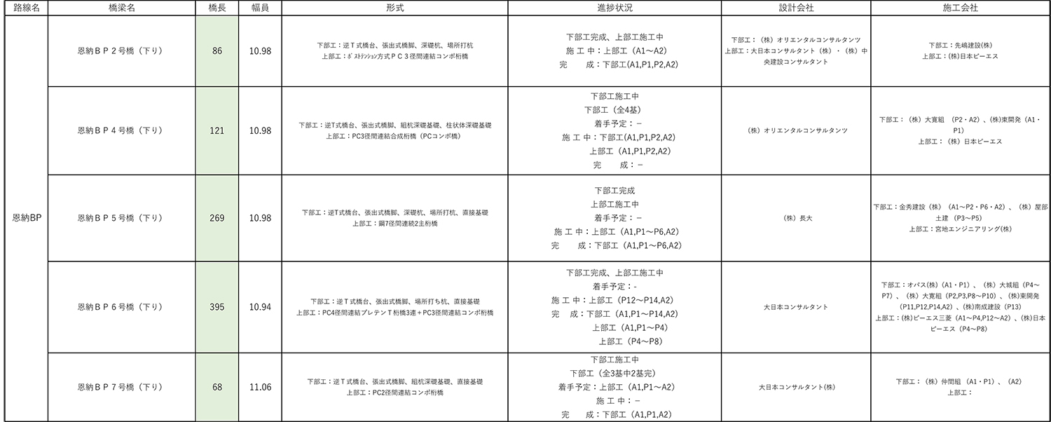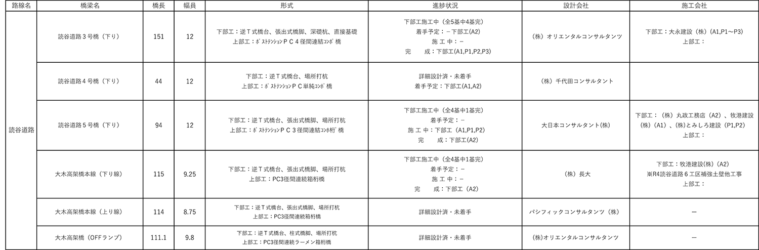 屋我 設計済み同3号橋上下部工(PCコンポ橋)、4号橋上下部工(下部工下りA2は9月25日に開札、PCコンポ橋)、5号橋上部工(下部工は施工中、PCコンポ橋)、大木高架橋本線上下線(上り114m、下り115m、いずれもPC箱桁)、大木高架橋OFFランプ(111m、PCラーメン橋)となっています。