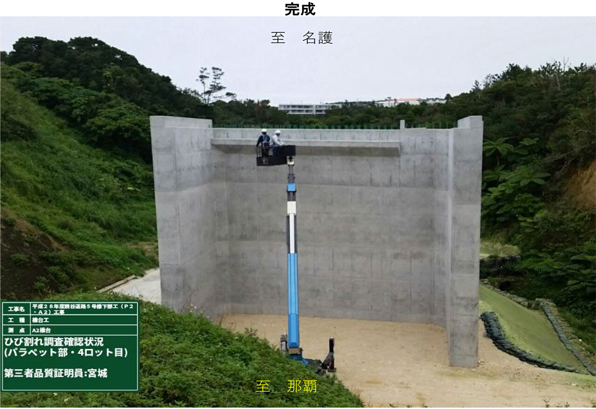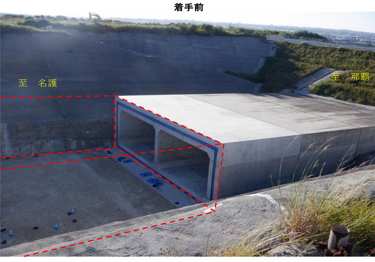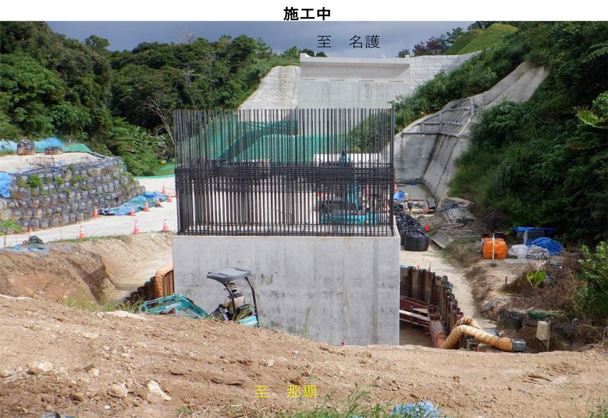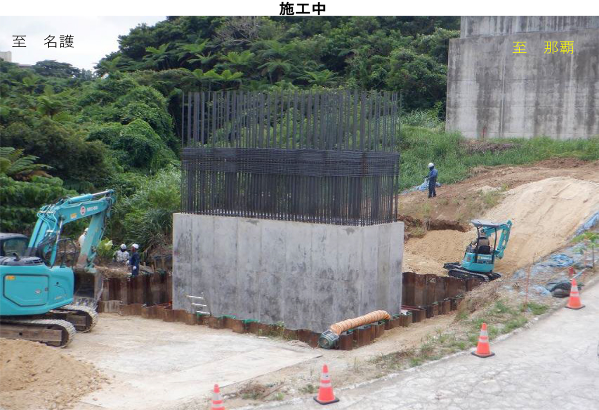 具体的には読谷道路5号橋の下りA1、P1、P2と開削トンネルの函渠の建設を進めています。開削トンネルは現在、23ブロックに分かれた延長281mのうち、11ブロック135mが完了しています。引き続き残り12ブロック146mを施工していく予定で、現在は2ブロックの施工を行っています。