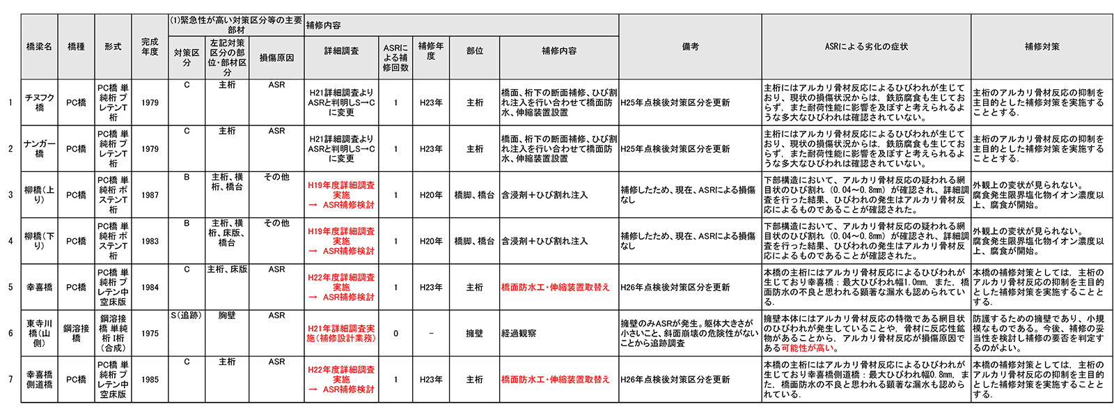 現在までのASR損傷橋梁一覧と対処状況
