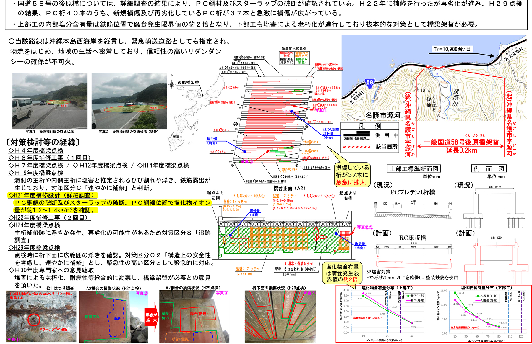 屋我 1977年に供用された東港橋(RC)では鉄筋被り40mmの主桁底面において、深度5cm位置で塩化物イオン量が1.9kg/m3に達していることを確認しています。また、82年供用の後原橋(PC)ではPC鋼材の破断及びスターラップの破断が認められ、PC鋼材位置で塩化物イオン量が約1.2~1.4kg/m3の値を示していました。そのため、両橋とも架け替えを選択しました。