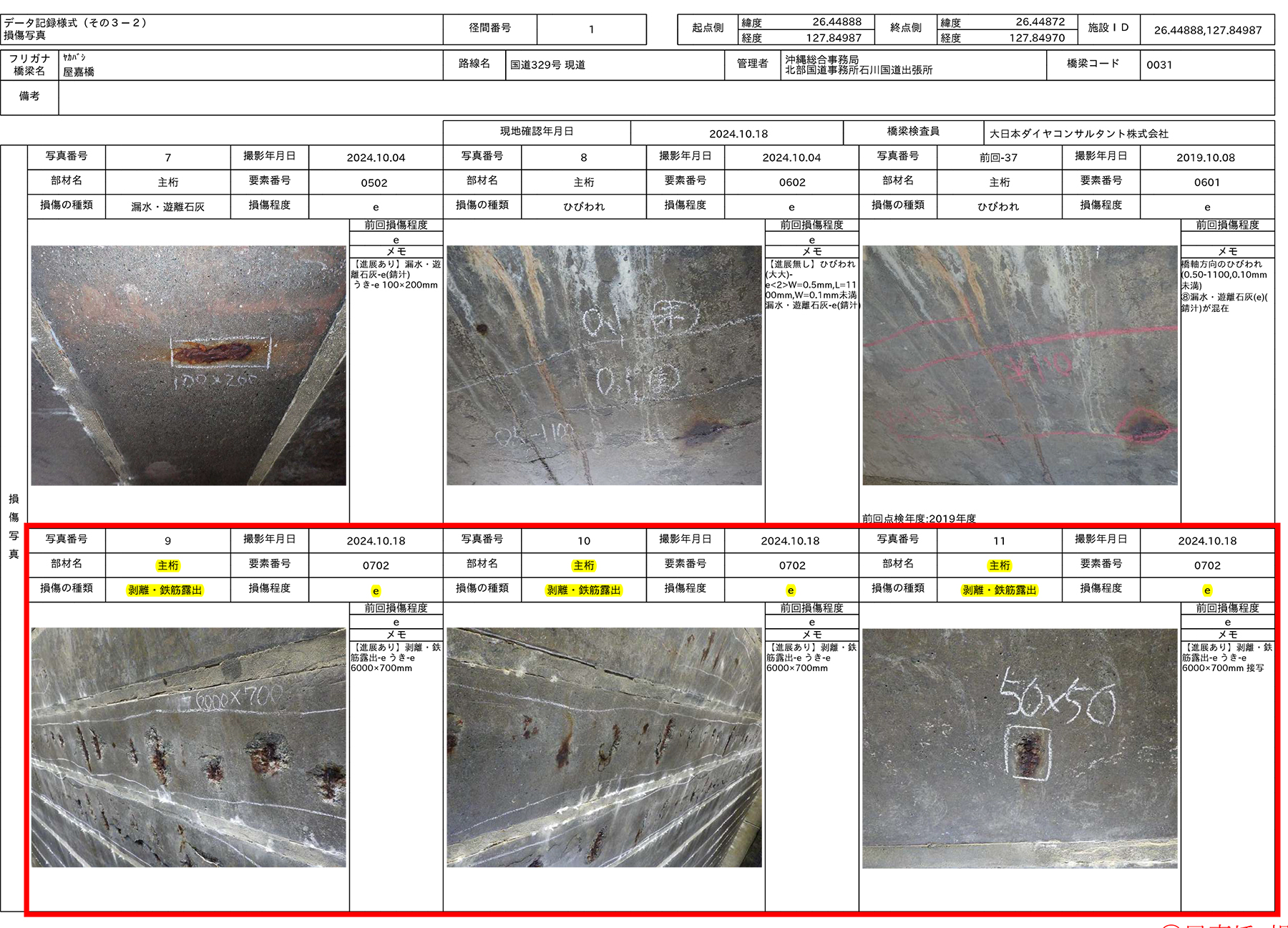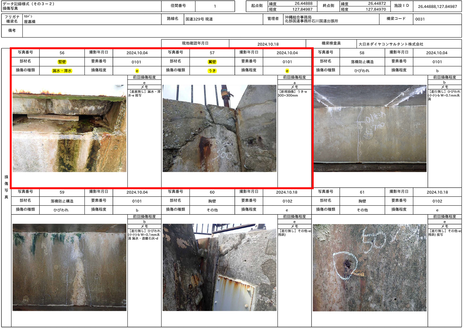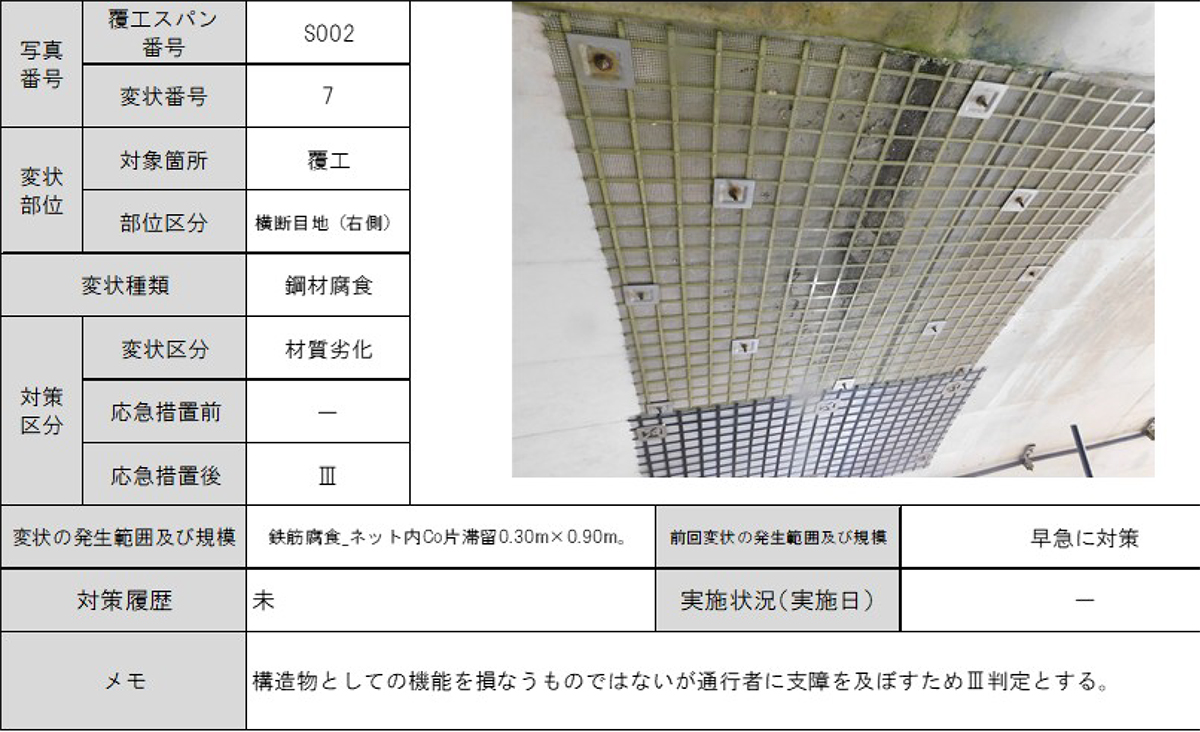 屋我 同橋は1977年に供用された橋長21.8mのPC橋です。損傷度程度の評価は「損傷なし a<b<c<d<e 損傷大」というジャッジで行われますが、同橋はコンクリート主桁でひびわれ(e)、うき(e)、剥離・鉄筋露出(e)、橋台でうき(e)、剥離・鉄筋露出(c)、漏水、滞水(e)、地覆でひびわれ(e)、うき(e)が生じており、何らかの対処が必要と判断しています。