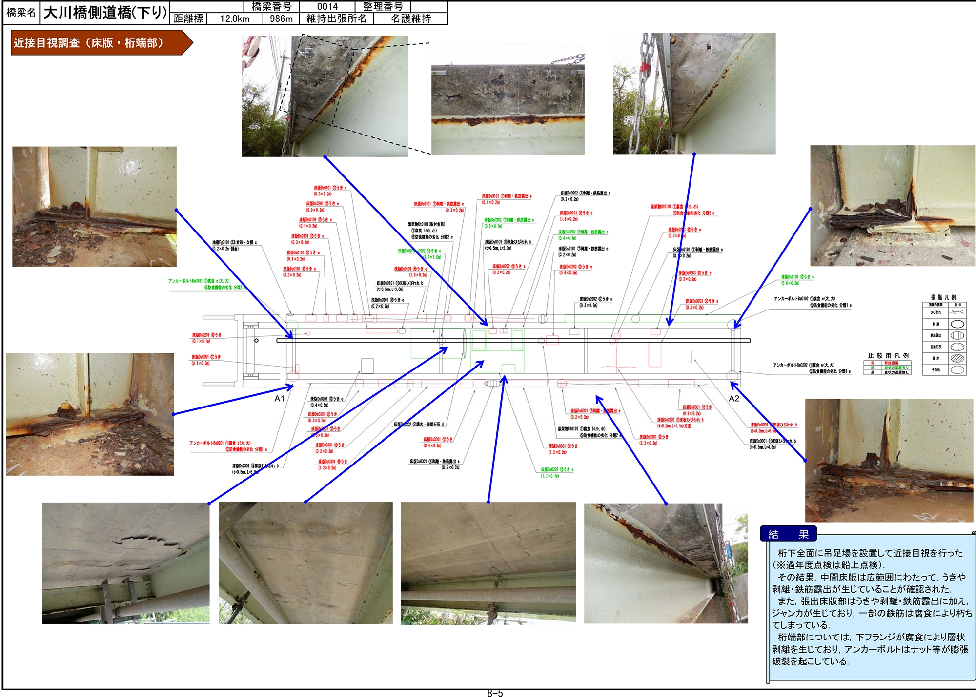 屋我 鋼橋の主な損傷は鋼桁の連結部(ボルト)、下フランジ部の腐食です。塩害が主因によるもので、付着した飛来塩分が降雨にも洗い流されにくい部分であること、また鋼材のエッジ部は塗装厚が薄くなりやすいことなどが要因と考えられます。