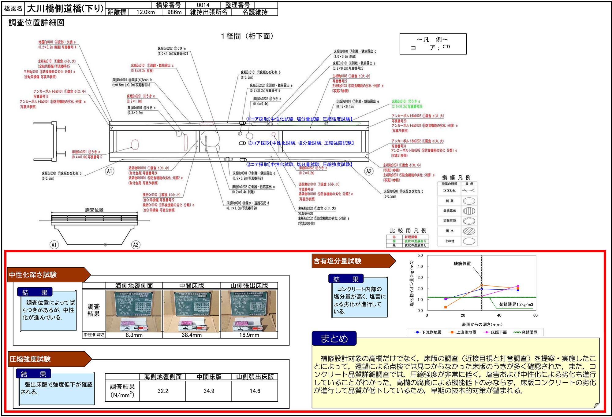 ――塩害をうけた橋について、もう少し損傷状況を具体的に教えて下さい。とりわけ、鉄筋近傍値の塩化物イオン量はどのくらいの値を示していますか