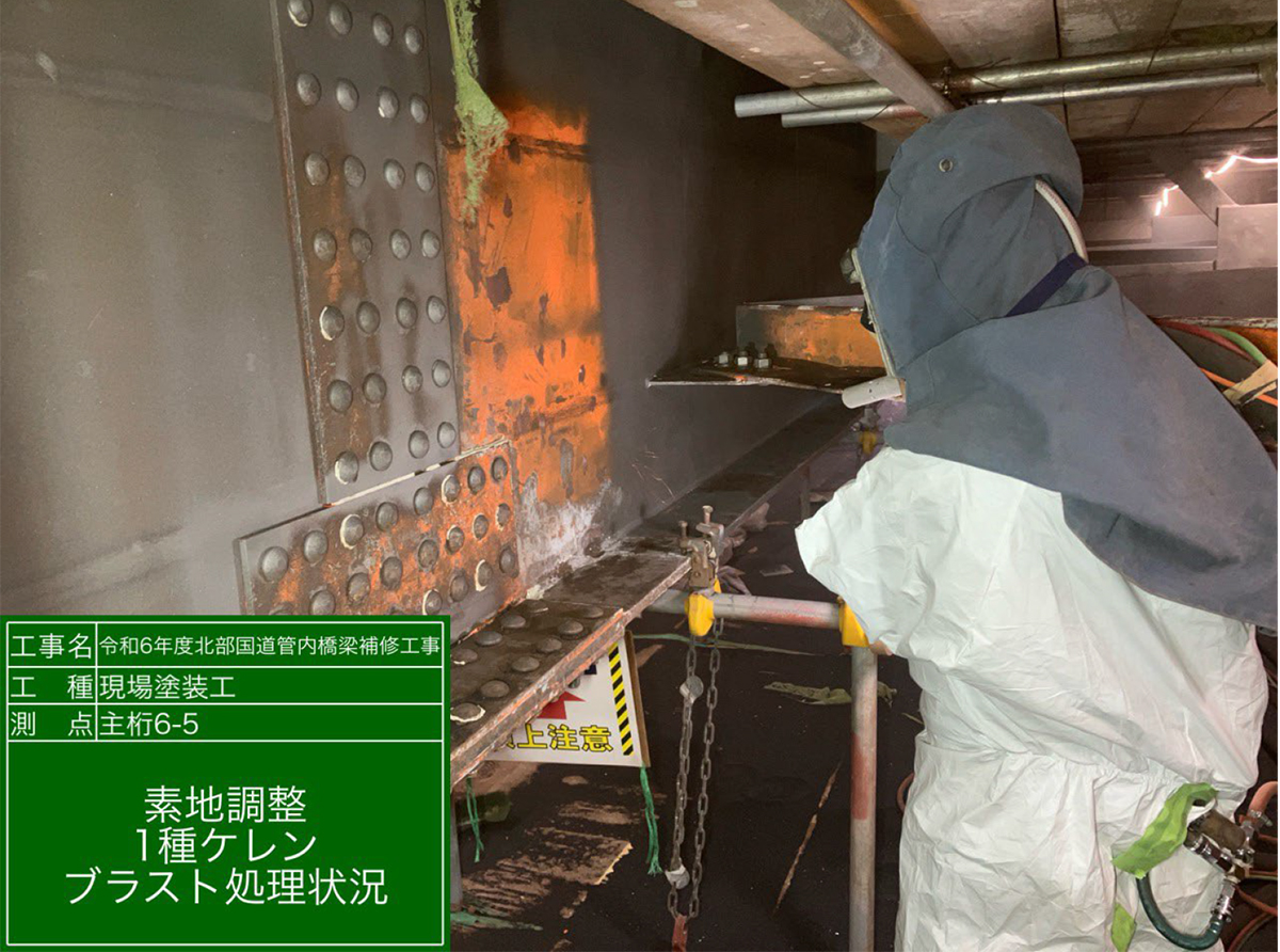 屋我 2025年は東寺川橋上り線で塗装塗替工2,730m2を実施しています。同橋の既設塗膜はPCB、鉛共に含んでおり、循環式ハイブリッドブラストシステム工法を用いて塗膜を除去した後で塗替えています。塗替えに際しては既設塗膜の除去に塗膜剥離剤の試験施工を行い、効果を確認した上で、経済性を比較しており、鋼材の素地調整(ブラスト工法)で浮き錆等の除去を行っています。施工に際しては夏場も行うため、現場内にドライクーラーを設置し大型扇風機を併用して冷気を拡散させ、作業員は個人用クーレットを装着し熱中症対策を行っています。さらに作業員休憩所では、遮熱テント設置及びミスト扇風機の活用、体調確認巡視記録を取り熱中症対策を実施しています。26年度の塗り替え発注予定は今の所ありません。