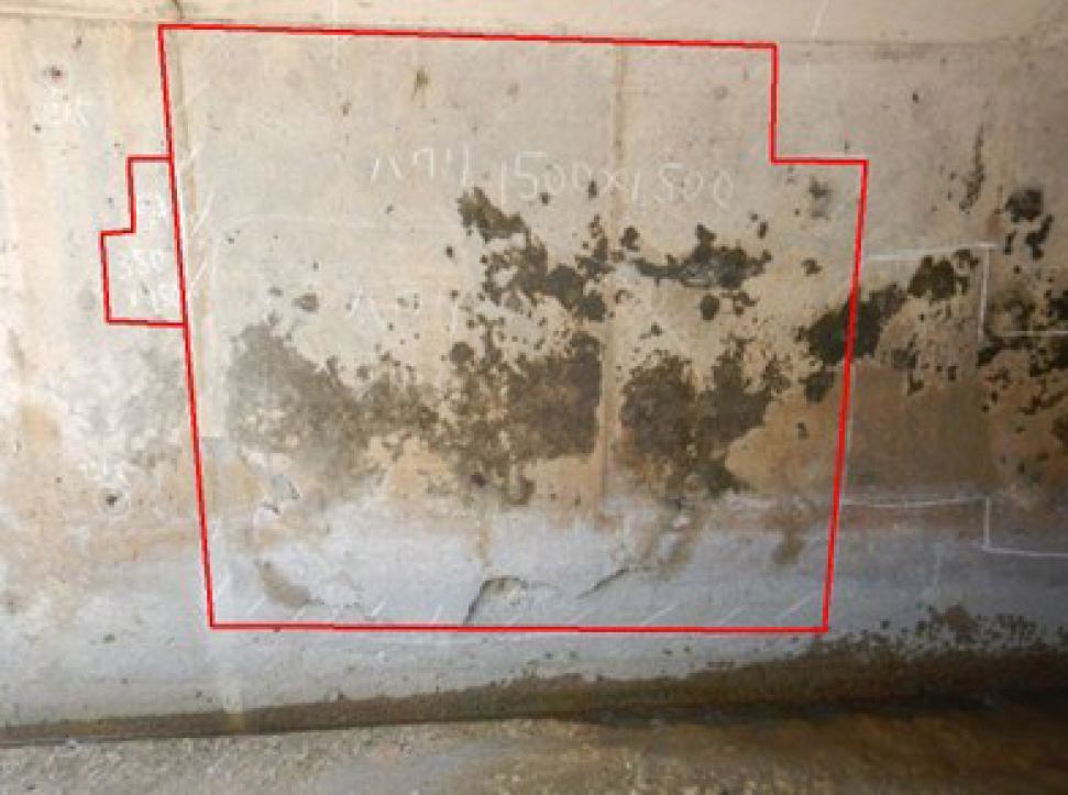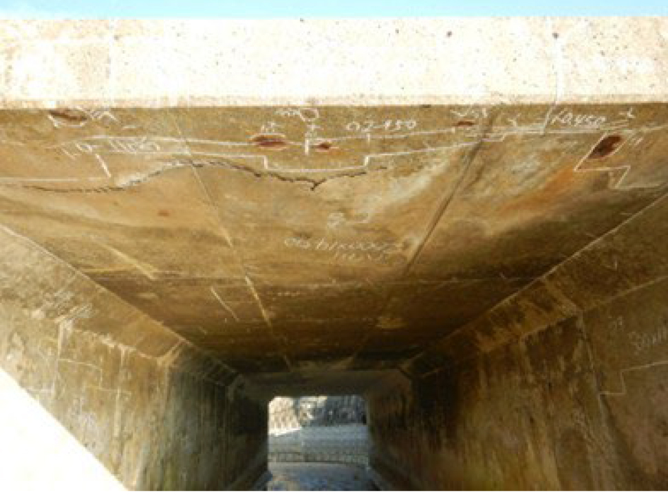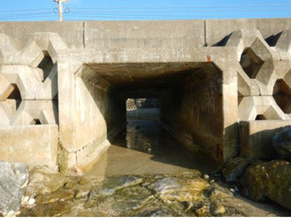 屋我 例えば溝橋9は1982年に供用された、橋長3.6m、幅員14.75mのRCボックスカルバートです。海岸沿いにあるため、塩害の影響を強く受けており、うき、剥離・鉄筋露出が生じています。簡易的なコンクリート防食塗装を施工していましたが、内部の鉄筋は著しく腐食している状態です。