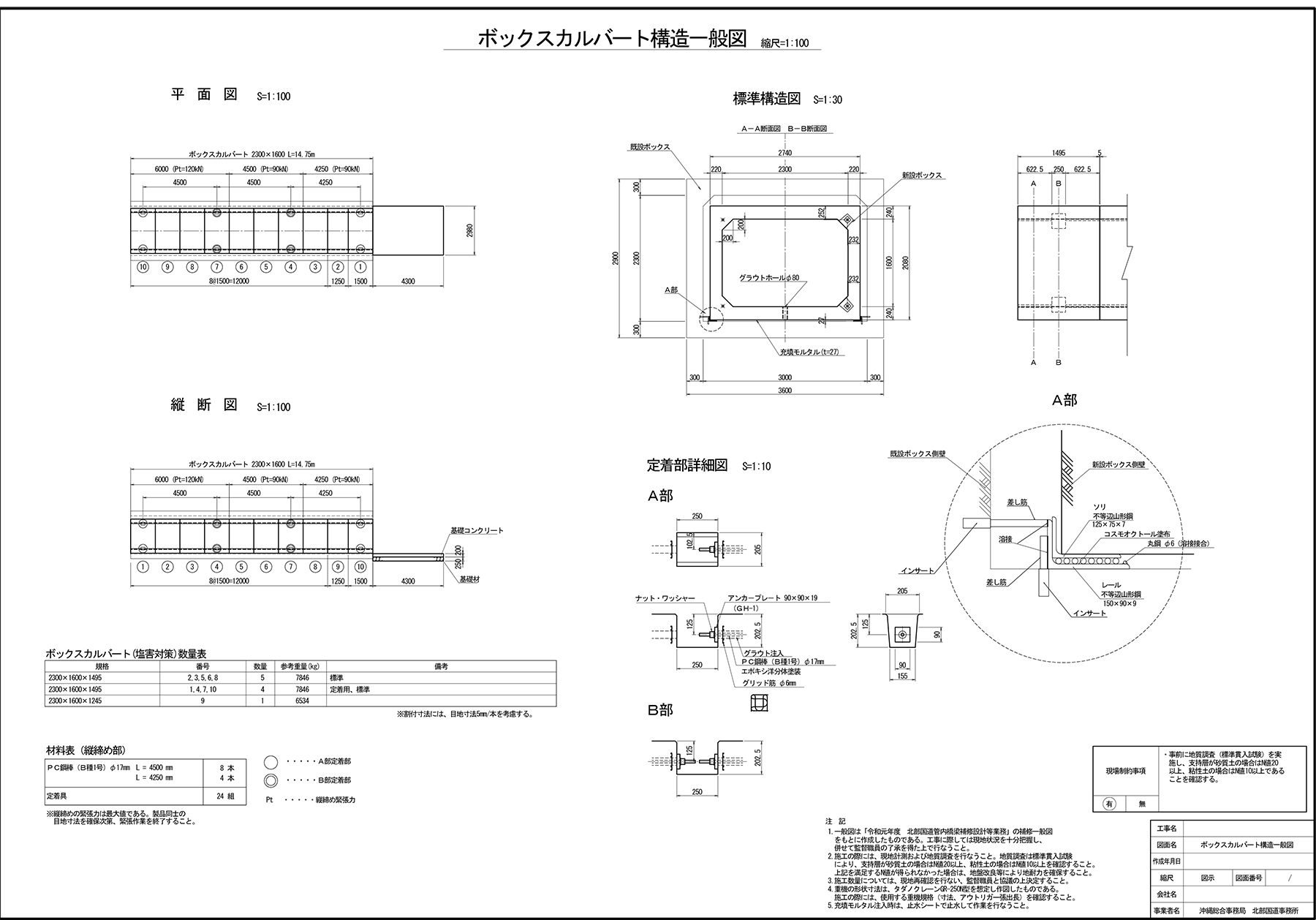 屋我 既設のボックスカルバートの内面に、新たなプレキャストのボックスカルバート(延長2.74m×幅14.75m×高さ2.08m )を挿入します。同カルバートの直下は小河川であり、水を通さねばなりませんが、元々の内空断面に60%程度の余裕があることから、このような補強工法が可能と判断しました。既設と新設の隙間には無収縮モルタルを打設して一体化させます。既設カルバートは塩害による損傷を受けていますが、無収縮モルタルを挟んでおりますので、新設カルバート側への塩化物イオンの移動による再劣化は生じにくいと考えております。塩害に対応するため、エポ鉄筋を用いるほか、新設カルバートの表面も防蝕します。